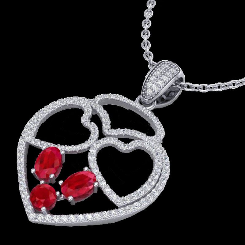 REF-117K8W -22541 ---- 3 CTW Ruby & Micro Pave Designer Inspired Heart Necklace 14K White Gold ---- Luxury Designer Brand Necklace Appraised at $9,050 Certificate Number US22541  14k White gold,  Necklace Size is 16 Inches, Necklace measuring approx. 1 1/2" x 1" , weighing in total approx. 7.3 grams. Made in the USA and is stamped 14k, Main stone 1.5 carat total weight containing 2 pieces of Mid-Opaque-Deep Red color with AAA quality Oval shape cut Ruby , Stone #2 0.3 carat total weight containing 1 pieces of Strong Red color with  Mid-Opaque quality Round shape cut Ruby , Stone #3 1.2 carat total weight containing 160 pieces of G-H color with VS/SI quality  Round shape cut Diamond