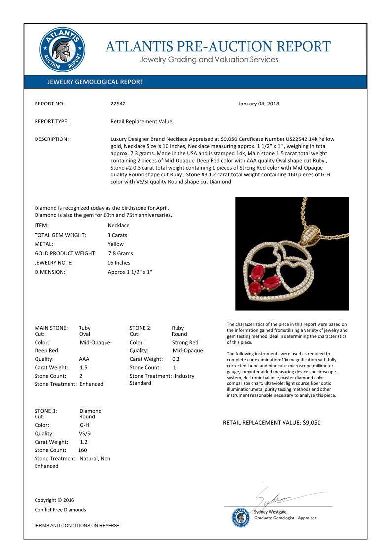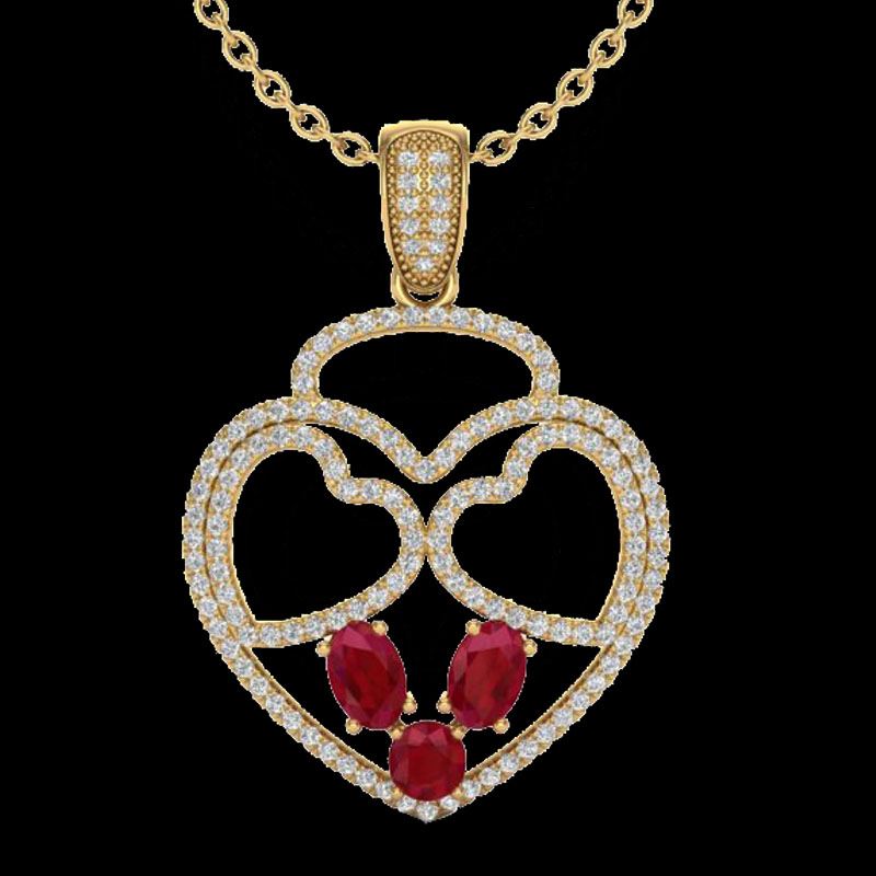 REF-117X8T -22542 ---- 3 CTW Ruby & Micro Pave Designer Inspired Heart Necklace 14K Yellow Gold ---- Luxury Designer Brand Necklace Appraised at $9,050 Certificate Number US22542 14k Yellow gold, Necklace Size is 16 Inches, Necklace measuring approx. 1 1/2" x 1" , weighing in total approx. 7.3 grams. Made in the USA and is stamped 14k, Main stone 1.5 carat total weight containing 2 pieces of Mid-Opaque-Deep Red color with AAA quality Oval shape cut Ruby , Stone #2 0.3 carat total weight containing 1 pieces of Strong Red color with Mid-Opaque quality Round shape cut Ruby , Stone #3 1.2 carat total weight containing 160 pieces of G-H color with VS/SI quality Round shape cut Diamond