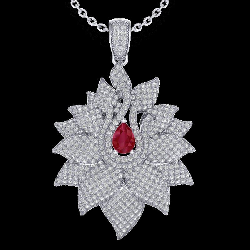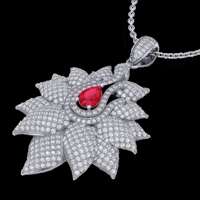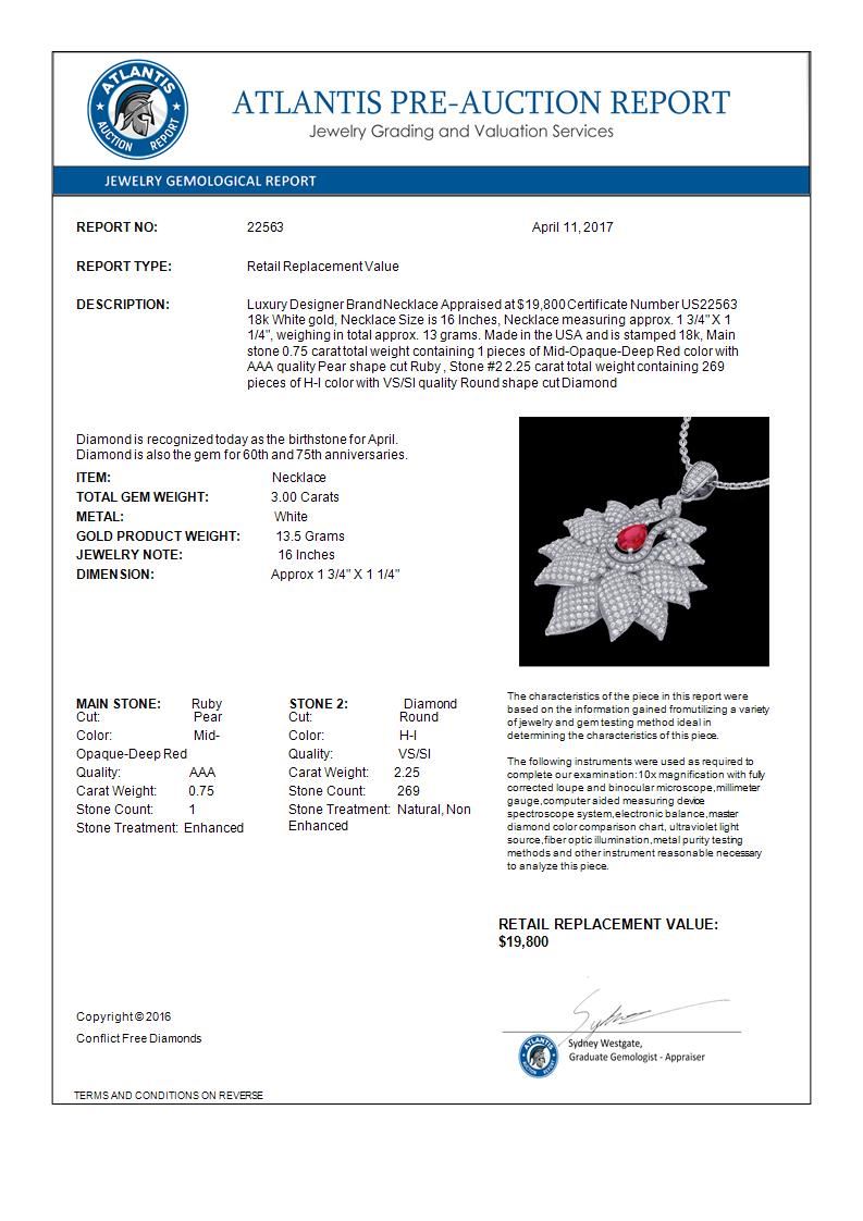 3 CTW Ruby & Micro Pave VS/SI Diamond Designer Necklace 18K White Gold ---- Luxury Designer Brand Necklace Appraised Retail Price at $19,800 ---- SKU Number US22563 18k White gold Necklace Size is 16 Inches, Necklace measuring approx. 1 3/4" X 1 1/4", weighing in total approx. 13 grams. Made in the USA and is stamped 18k, Main stone 0.75 carat total weight containing 1 pieces of Mid-Opaque-Deep Red color with AAA quality Pear shape cut Ruby , Stone #2 2.25 carat total weight containing 269 pieces of H-I color with VS/SI quality Round shape cut