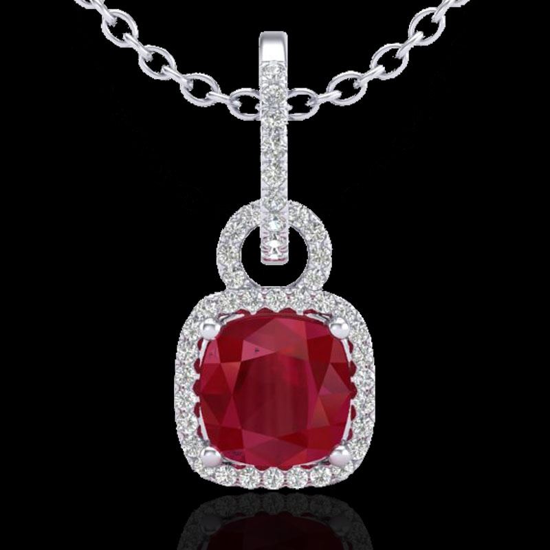 REF-76X4T -22988 ---- 3 CTW Ruby & Micro VS/SI Diamond Necklace 18K White Gold ---- Luxury Designer Brand Necklace Appraised at $5,450 Certificate Number US22988 18k White gold, Necklace Size is 16 Inches, Necklace measuring approx. 7/16"X7/16" , weighing in total approx. 4.2 grams. Made in the USA and is stamped 18k, Main stone 2.6 carat total weight containing 1 pieces of Mid-Opaque-Deep Red color with AAA quality Cushion shape cut Ruby , Stone #2 0.4 carat total weight containing 28 pieces of H-I color with VS/SI quality Round shape cut Diamond