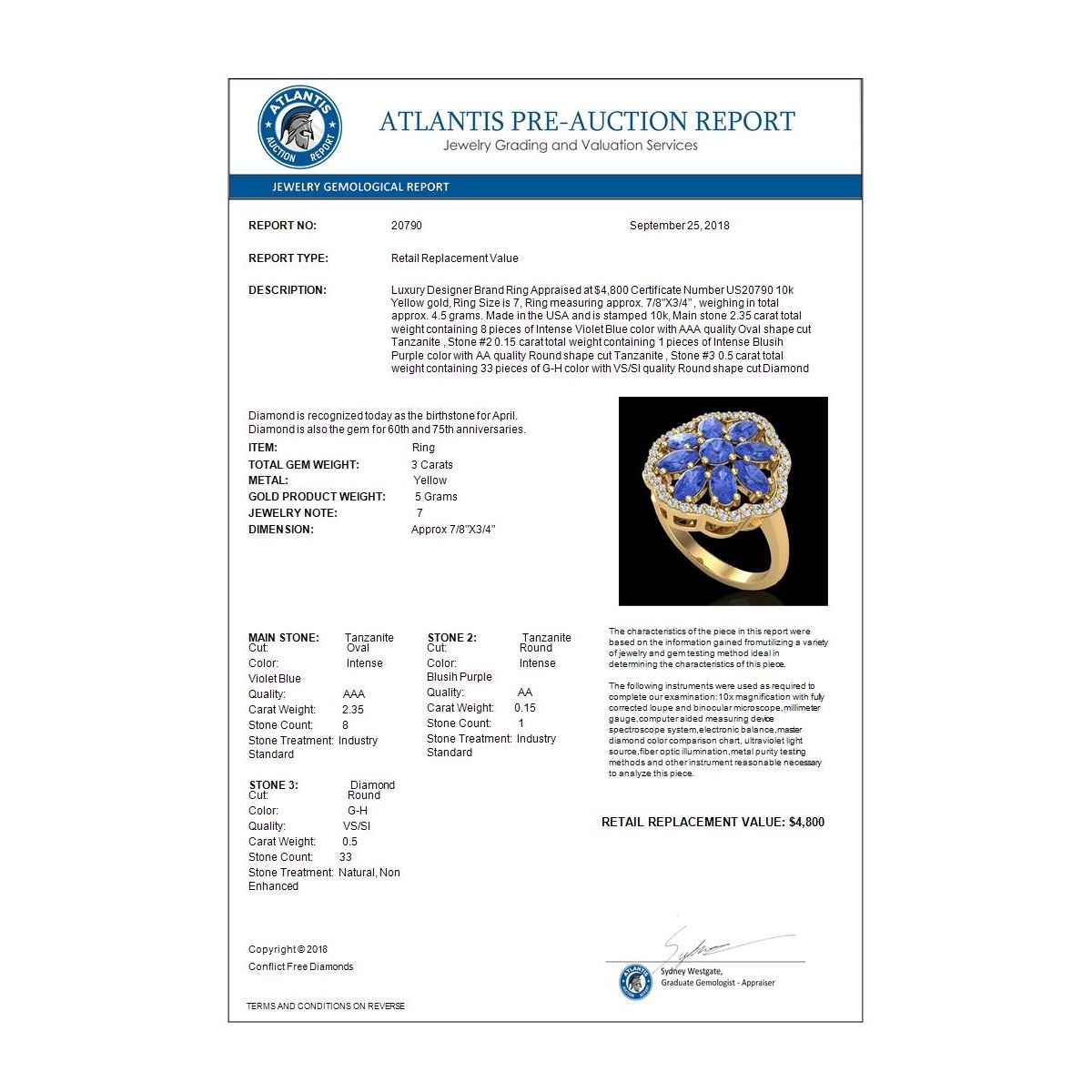 REF-67M5H -20790 ---- 3 CTW Tanzanite & VS/SI Diamond Cluster Designer Halo Ring 10K Yellow Gold ---- Luxury Designer Brand Ring Appraised at $4,800 Certificate Number US20790 10k Yellow gold, Ring Size is 7, Ring measuring approx. 7/8"X3/4" , weighing in total approx. 4.5 grams. Made in the USA and is stamped 10k, Main stone 2.35 carat total weight containing 8 pieces of Intense Violet Blue color with AAA quality Oval shape cut Tanzanite , Stone #2 0.15 carat total weight containing 1 pieces of Intense Blusih Purple color with AA quality Round shape cut Tanzanite , Stone #3 0.5 carat total weight containing 33 pieces of G-H color with VS/SI quality Round shape cut Diamond