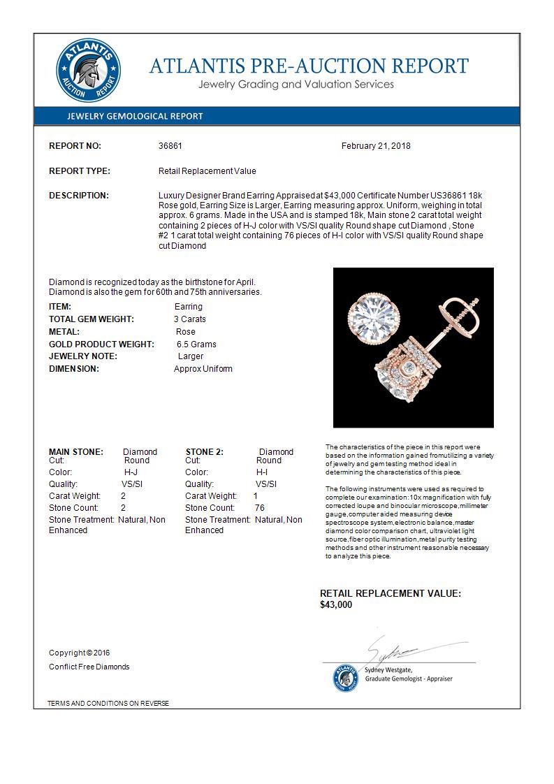 REF-586N6Y -36861 ---- 3 CTW VS/SI Diamond Solitaire Art Deco Stud Earrings 18K Rose Gold ---- Luxury Designer Brand Earring Appraised at $43,000 Certificate Number US36861 18k Rose gold, Earring Size is Larger, Earring measuring approx. Uniform, weighing in total approx. 6 grams. Made in the USA and is stamped 18k, Main stone 2 carat total weight containing 2 pieces of H-J color with VS/SI quality Round shape cut Diamond , Stone #2 1 carat total weight containing 76 pieces of H-I color with VS/SI quality Round shape cut Diamond