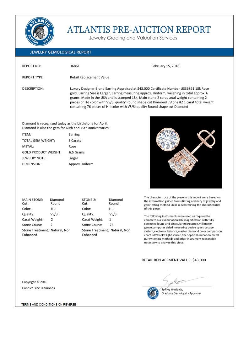 REF-586N6Y -36861 ---- 3 CTW VS/SI Diamond Solitaire Art Deco Stud Earrings 18K Rose Gold ---- Luxury Designer Brand Earring Appraised at $43,000 Certificate Number US36861 18k Rose gold, Earring Size is Larger, Earring measuring approx. Uniform, weighing in total approx. 6 grams. Made in the USA and is stamped 18k, Main stone 2 carat total weight containing 2 pieces of H-J color with VS/SI quality Round shape cut Diamond , Stone #2 1 carat total weight containing 76 pieces of H-I color with VS/SI quality Round shape cut Diamond