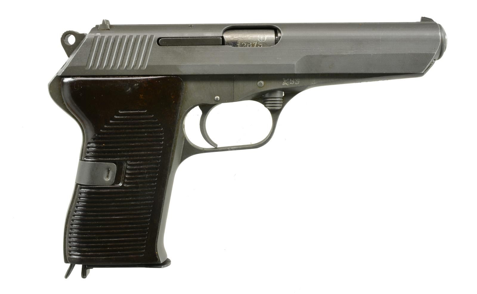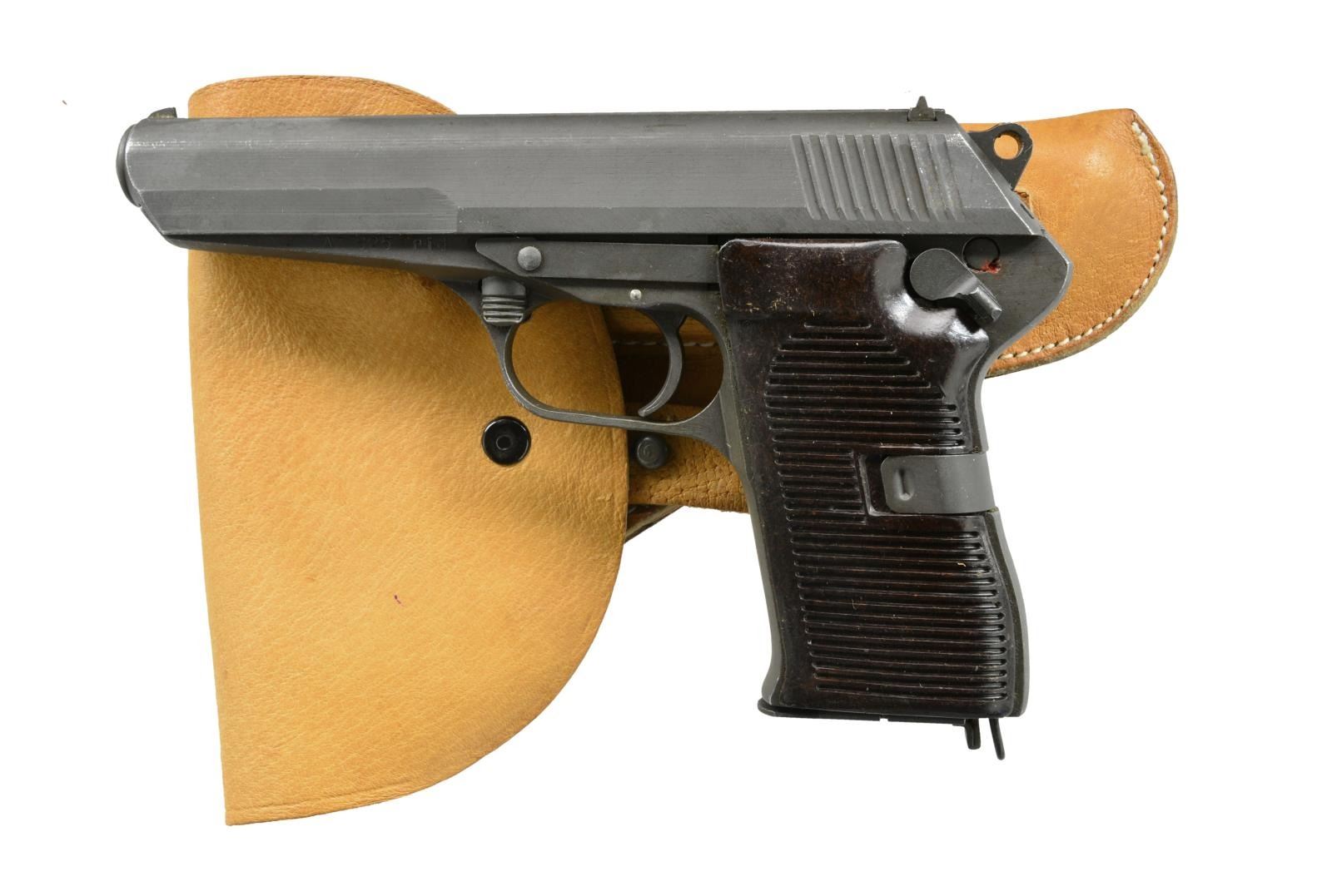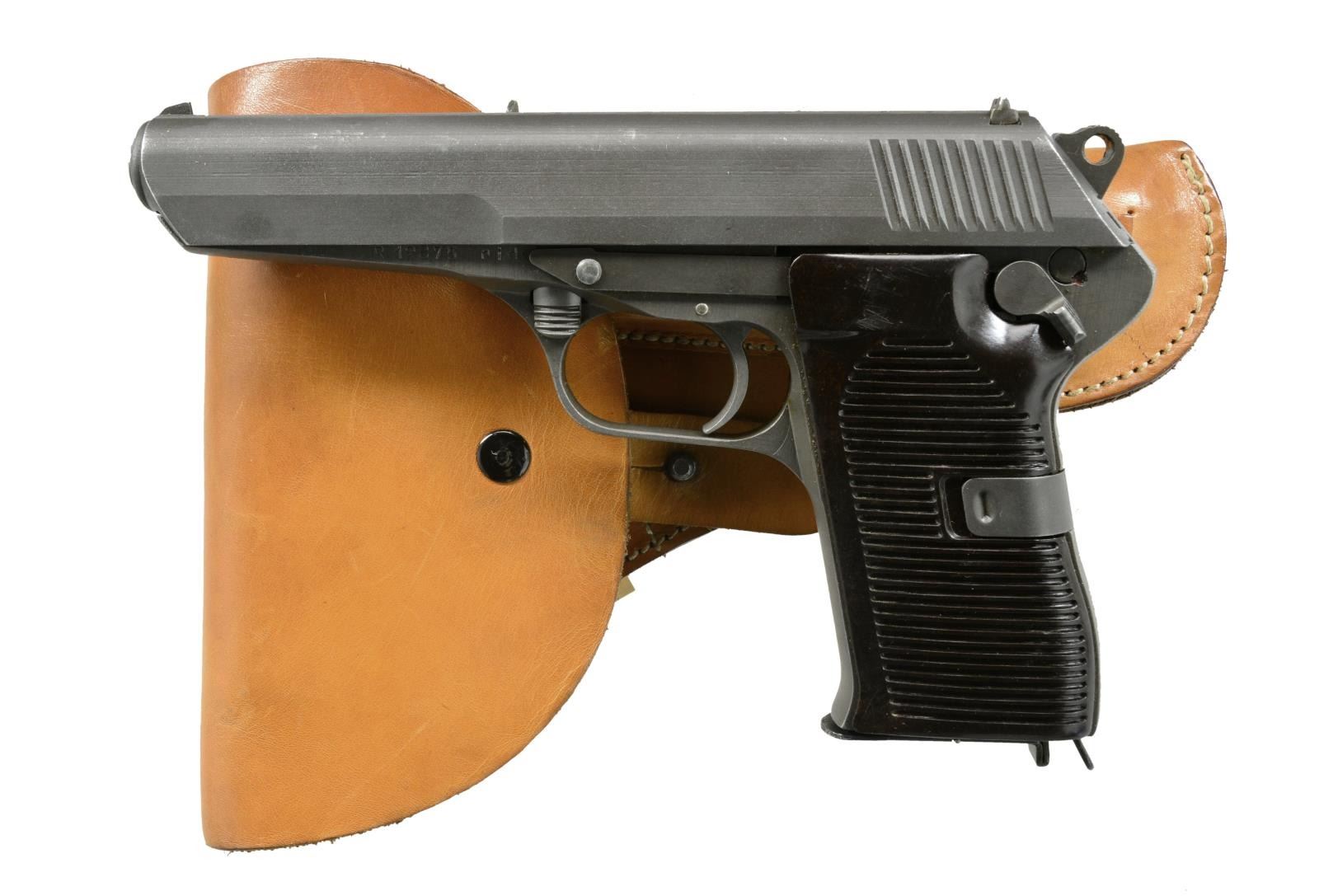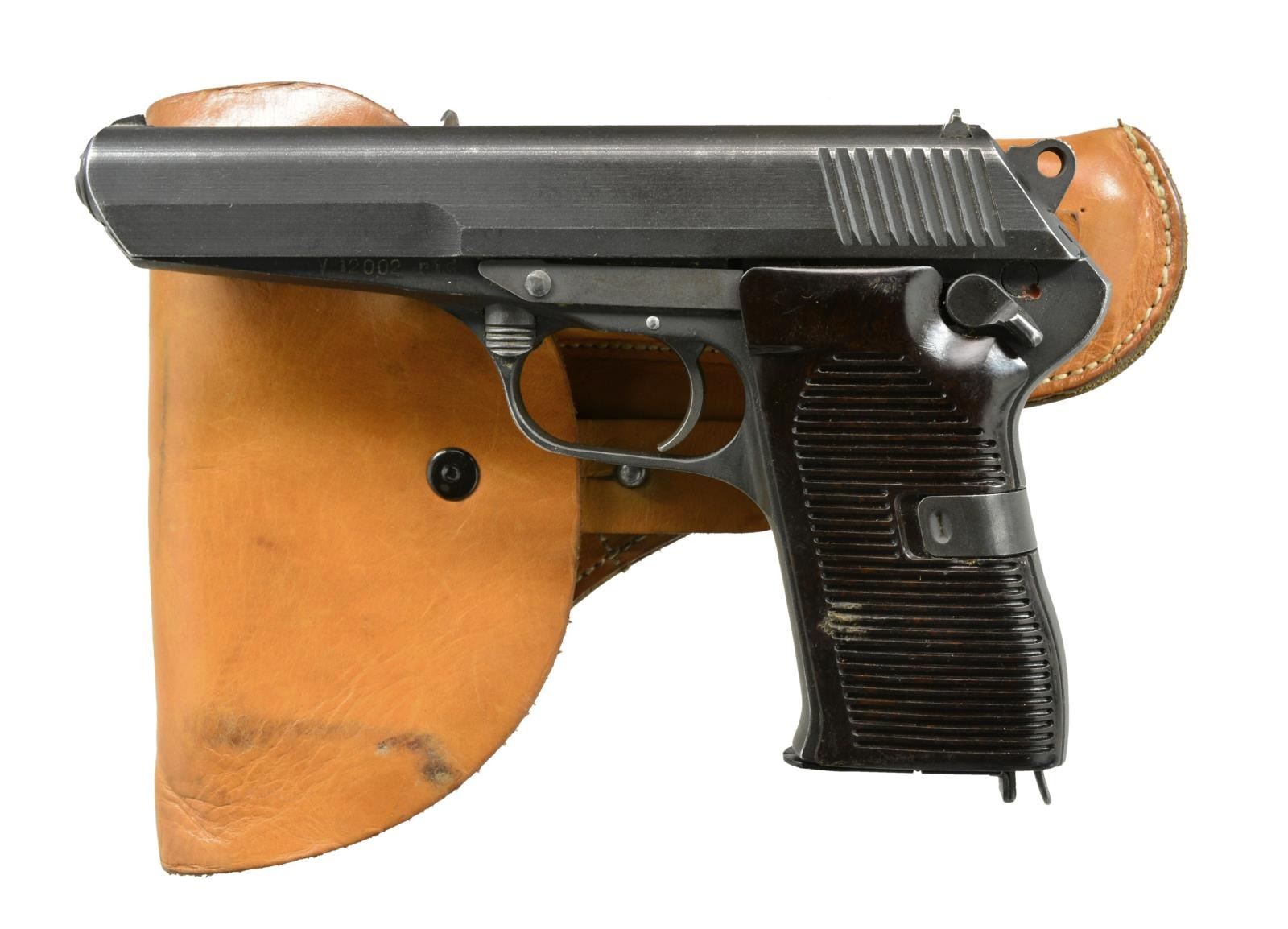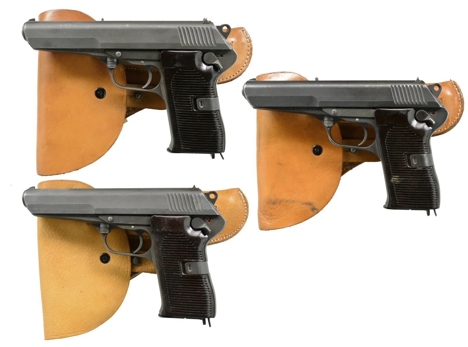 ALL: Cal. 7.62x25. Bbl. 4.9". Parkerized finish w/ grooved brown Bakelite grips. SA functioning w/ spur hammer & frame mounted safety / decocker. TG import marked. Roller locking bbl. assembly. Matching numbered slides & bbls. MAGS: 6 good 8 rd. UNATTACHED ACCESSORIES: 3 good tan flap holsters w/ strap & stud retention. CONDITION: good to very good w/ occasional light high point wear & light marks. Very good grips; near excellent bores. 1) S# R12875. Mfg. 1953. (20-2203/NW). 2) S# AZ 825. Mfg. 1954. (20-2204/NW). 3). S# V12002. Mfg. 1953. (20-2205/NW). ALL CURIO. $750-1,000.