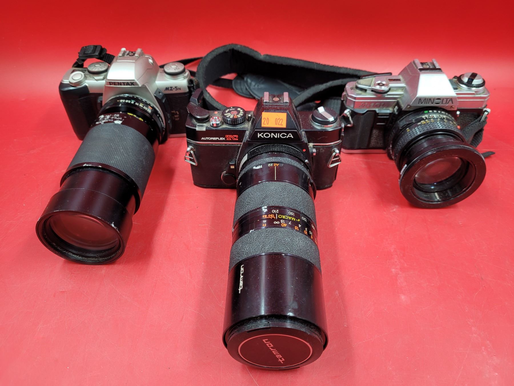 3 Cameras (Minolta, Konica, & Pentax) w/ Lens Attachments (Tamron, etc.)