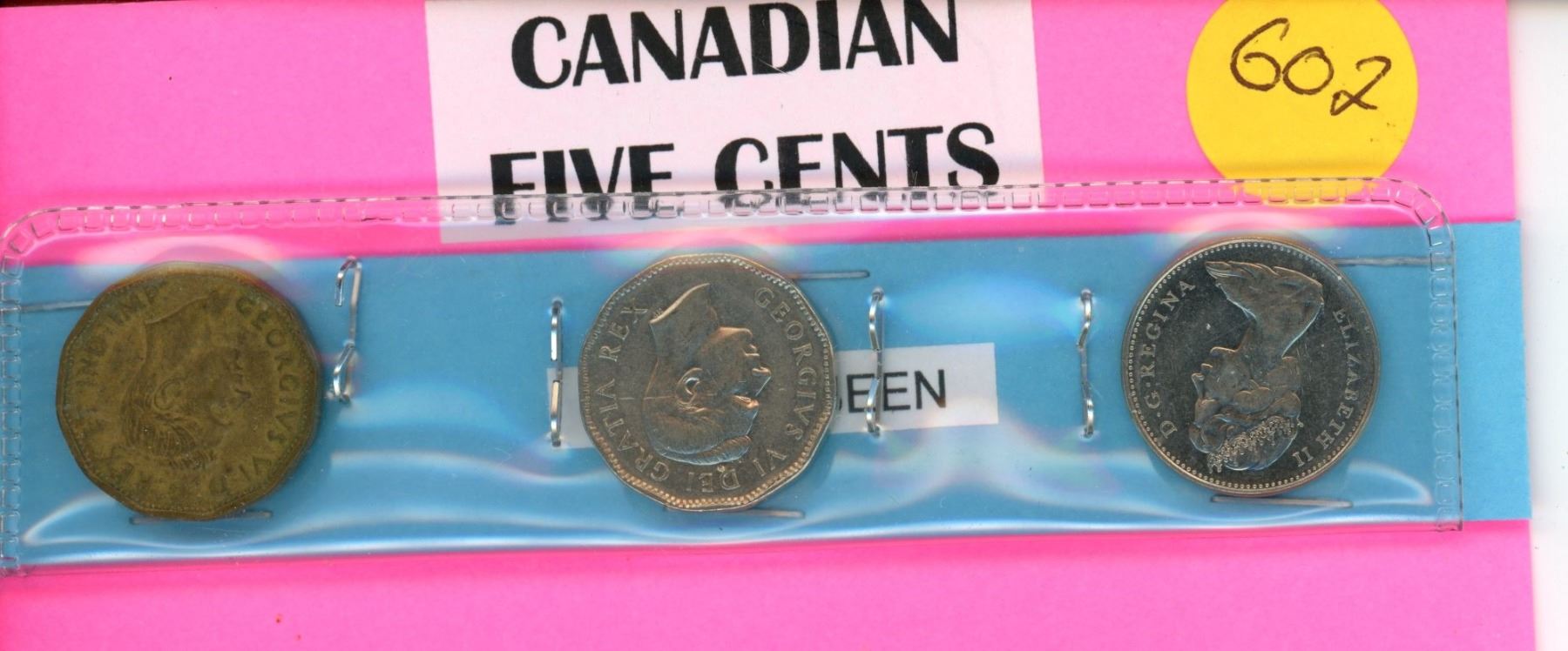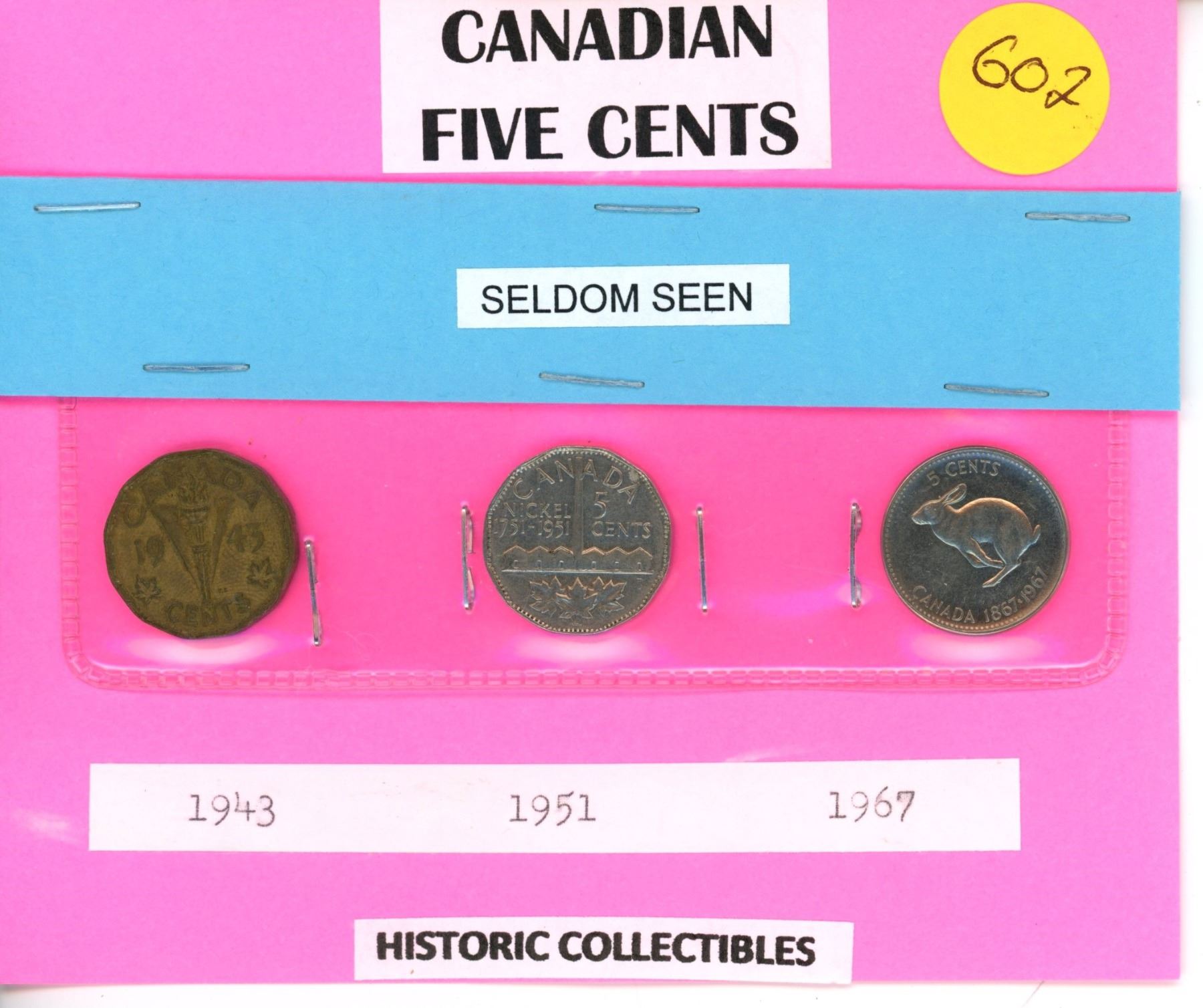 (3) Canadian 5¢ - 1943 Tombac, 1951 Refinery, 1967 Rabbit