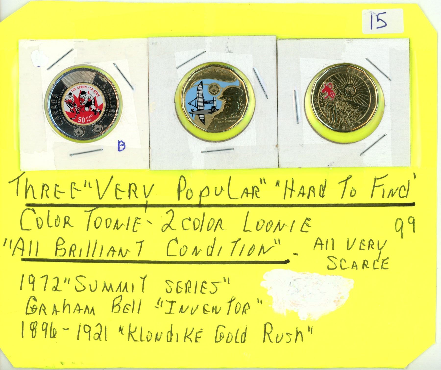 3 Canadian coins - 2 dollar coin, Summit series & Two, 1 dollar coins - Graham Bell & Klondike Gold rush
