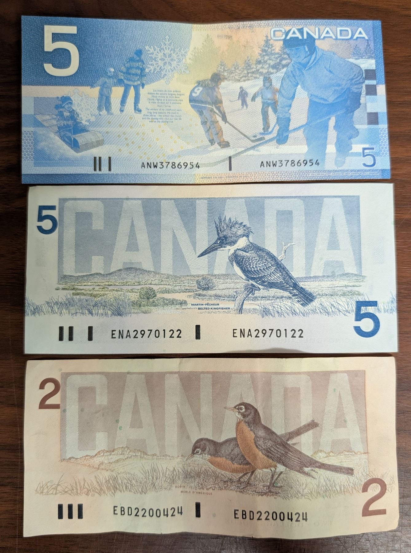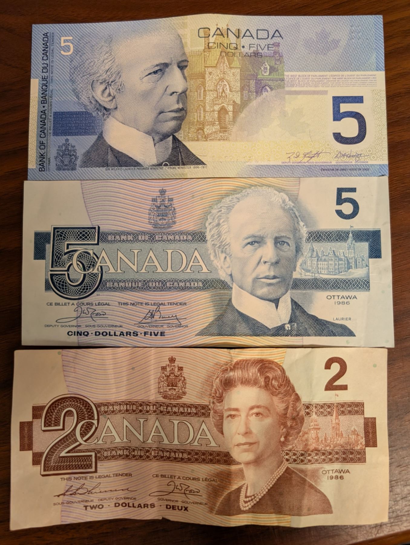 (3) Canadians Bills (2) 5 and 2 Dollar Bills and (1) 2002 5 Dollar Bill