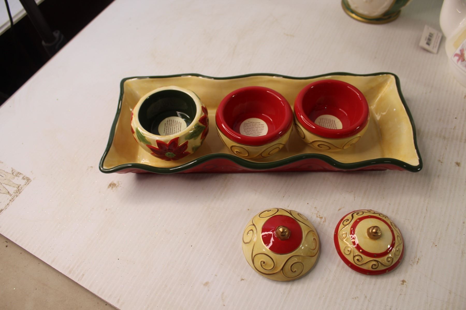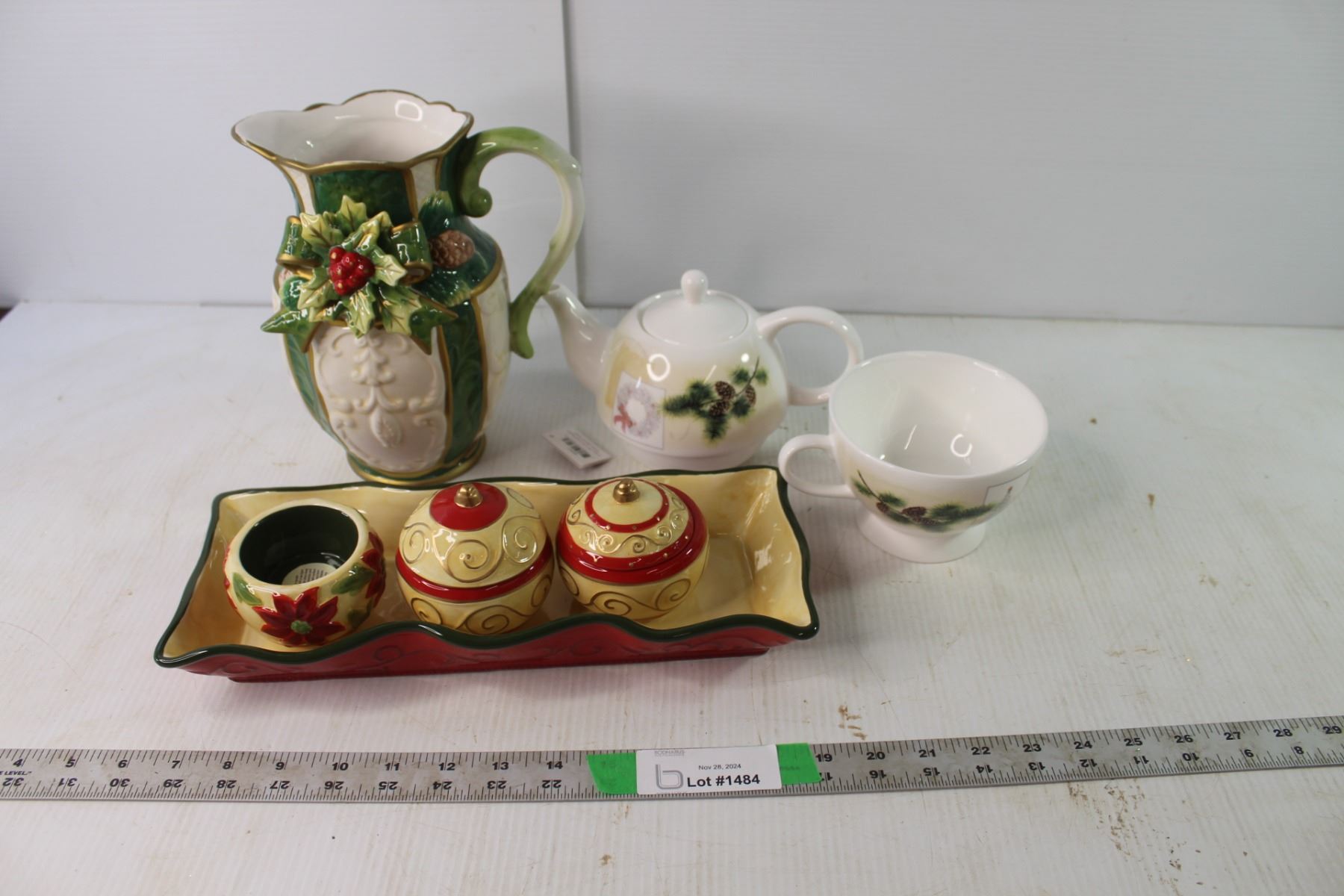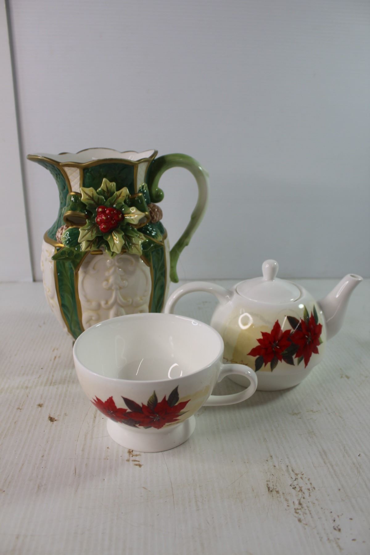 (3) Candle Holders, Tea Pot and Cup in One & Christmas Pitcher
