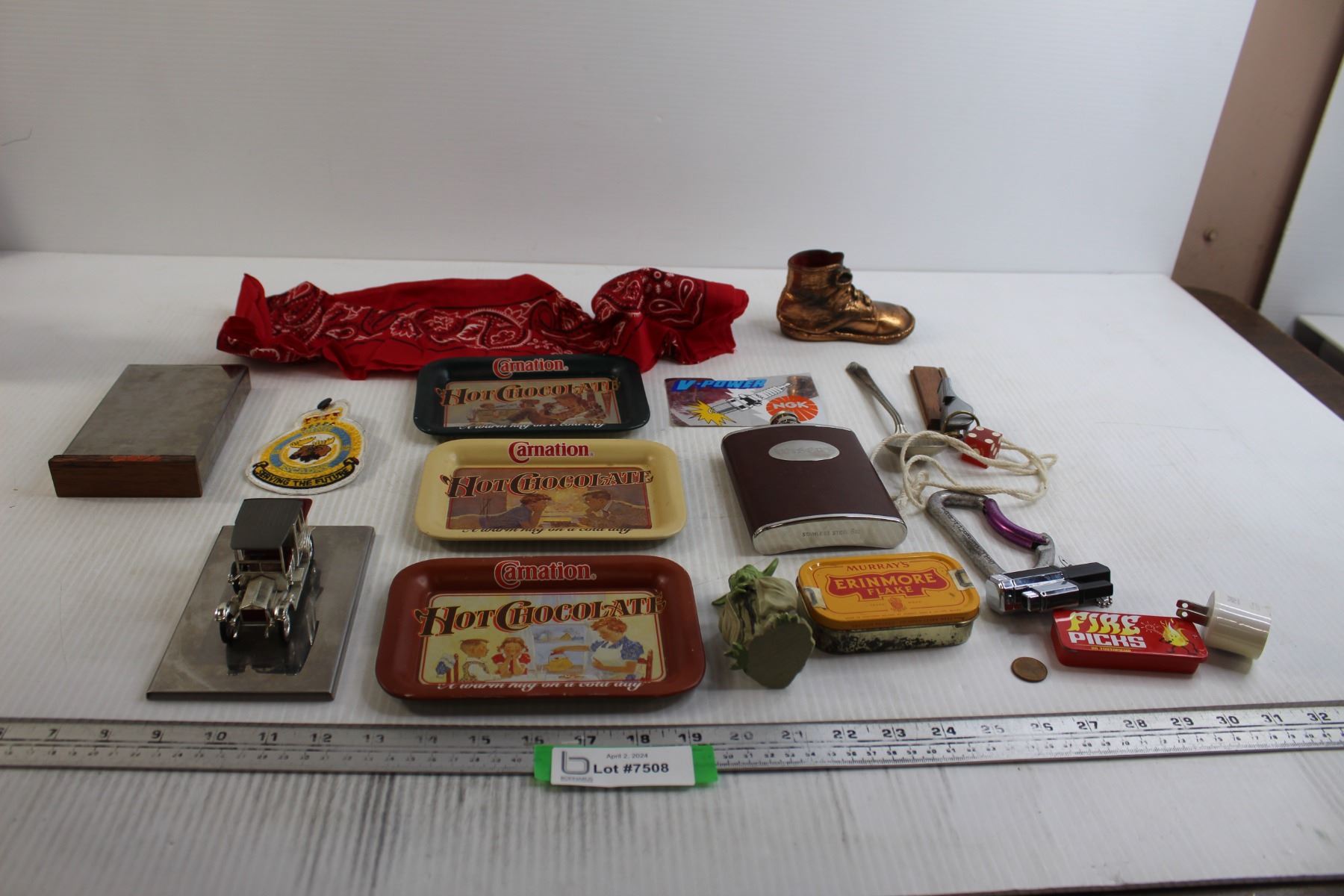 (3) Carnation Trays, Bandana, Flask, Misc.