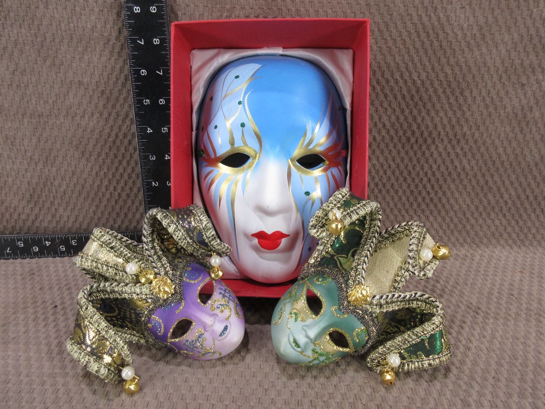 3 Carnival Masks - 2 Small Plastic, 1 Large Porcelain
