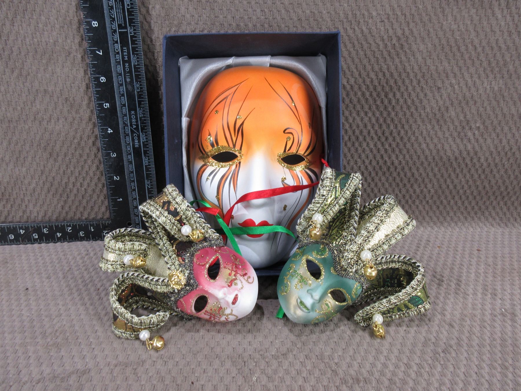 3 Carnival Masks - 2 Small Plastic, 1 Large Porcelain