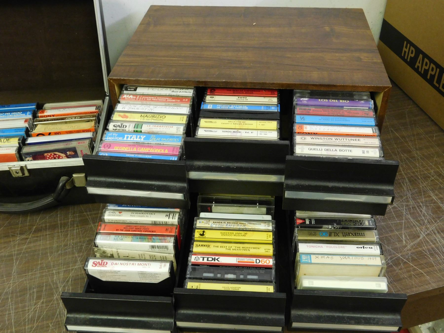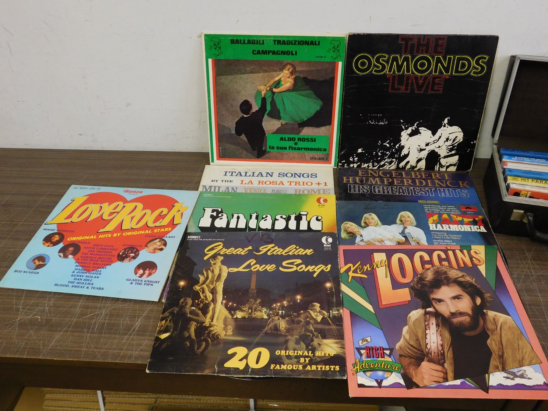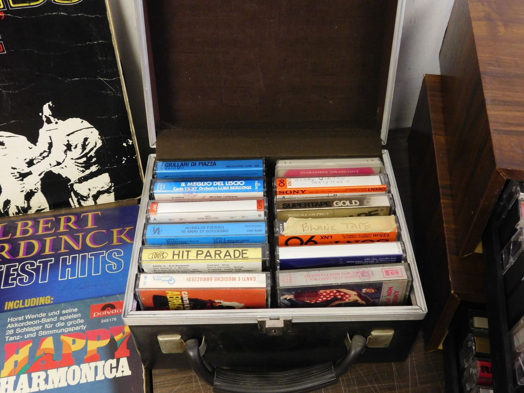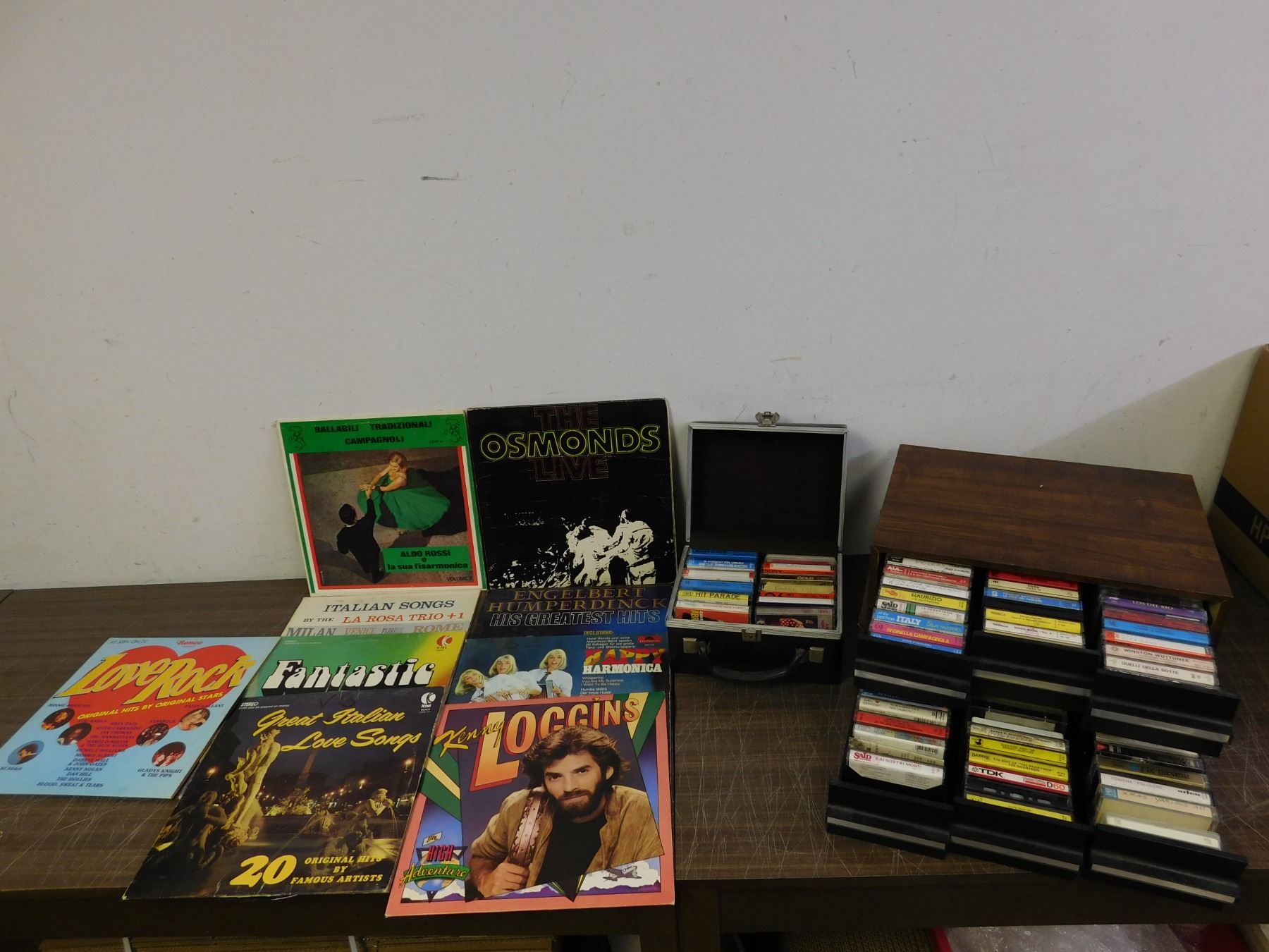3 Cassette Tape Holders filled with random tapes along with 9 Records.