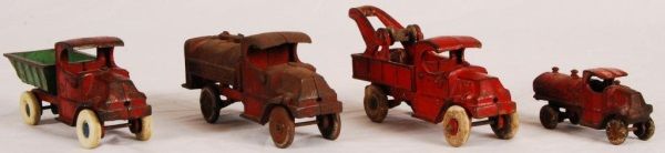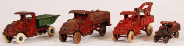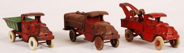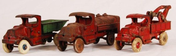 Champion Tow Truck (8-1/2"), Dump Truck (8-1/2" L); Champion Case Motor Oil Truck (8" L).