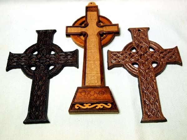 3 Celtic Crosses, largest measures 5'' x 10'', 2 are cast metal and largest one is wood, the wood one is marked Islandcraft Celtic Carvings