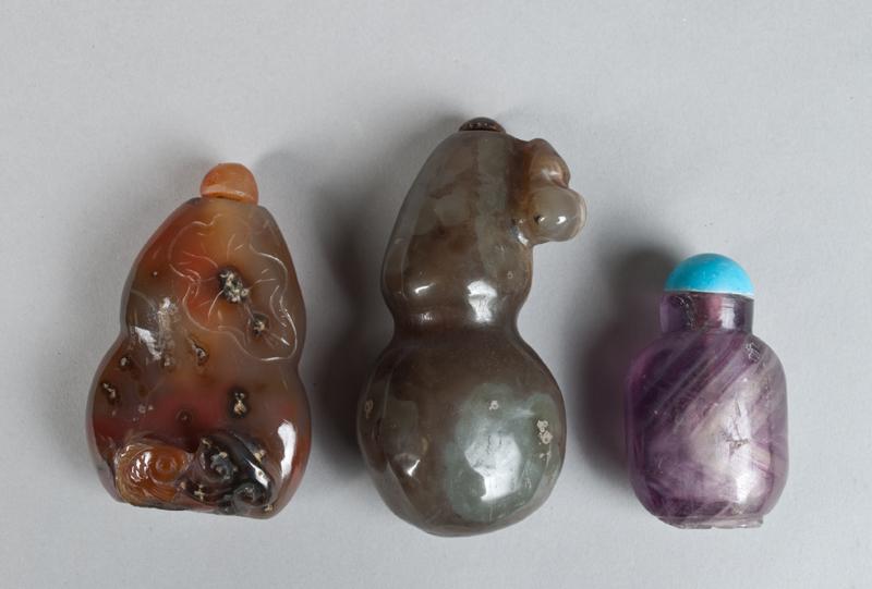 All of naturalistic form with Hardstone stoppers. Tallest 3.5" H, circa early 20th century.