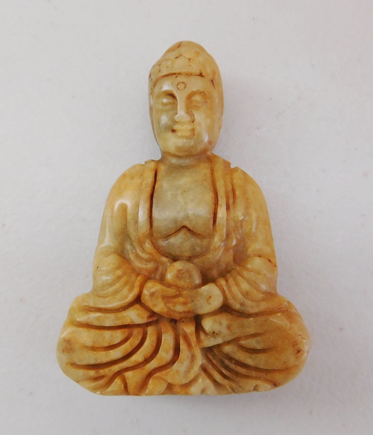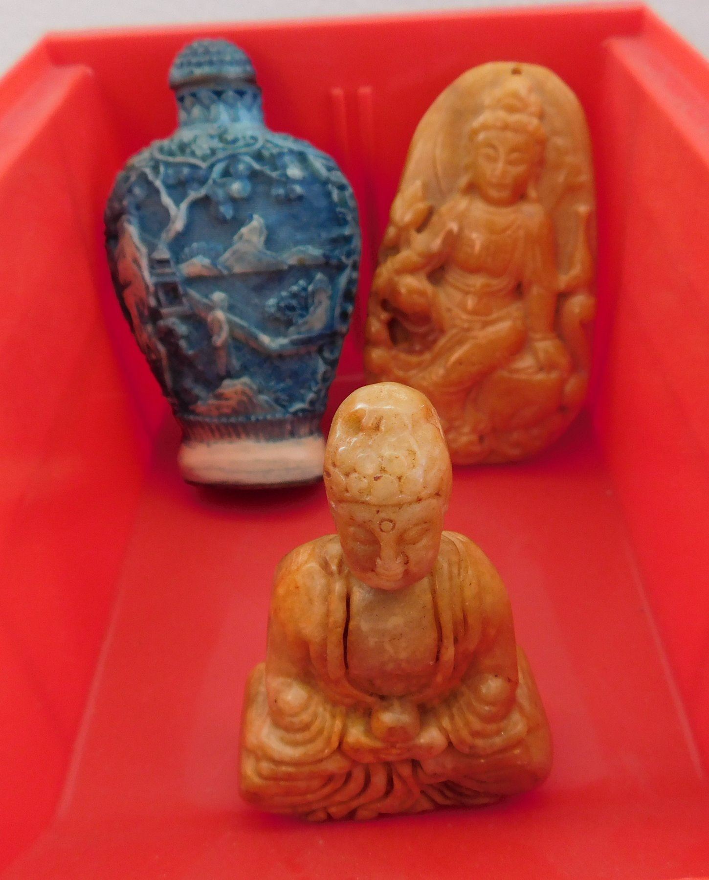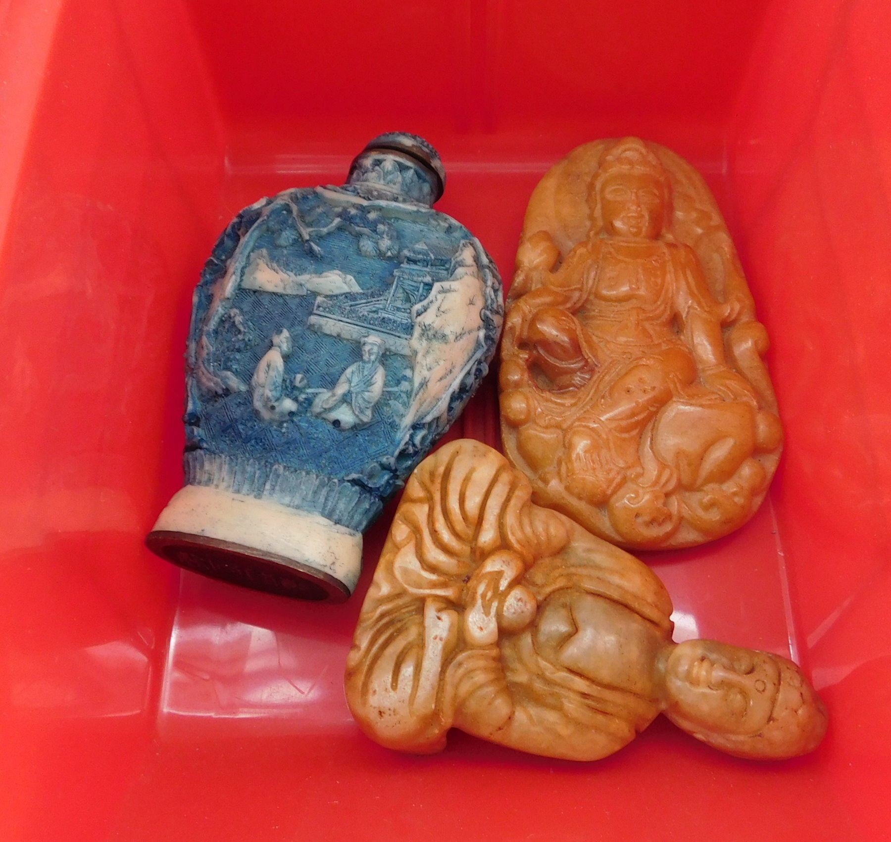 3 Chinese Carvings, circa 1900s. Made of jade and bone, the items are 2.5" to 3" long. China. Buddha, snuff bottle. Condition: Good, see images. Shipping: $22.50 w/insurance and signature.