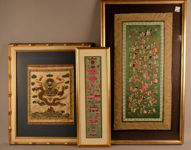 3 Chinese Embroideries in Frames Various Sizes 23" w x