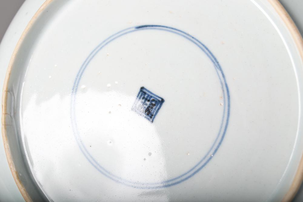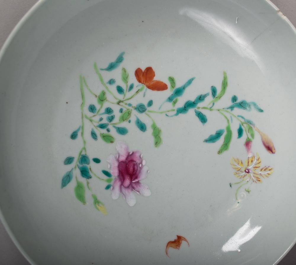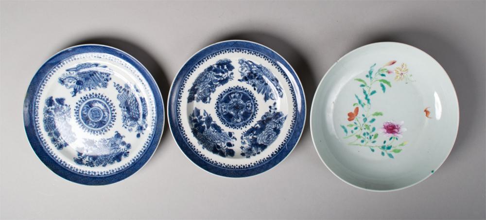 To include two blue and white dishes, one Famille rose. Largest 8"Dia. 18th/19th century.