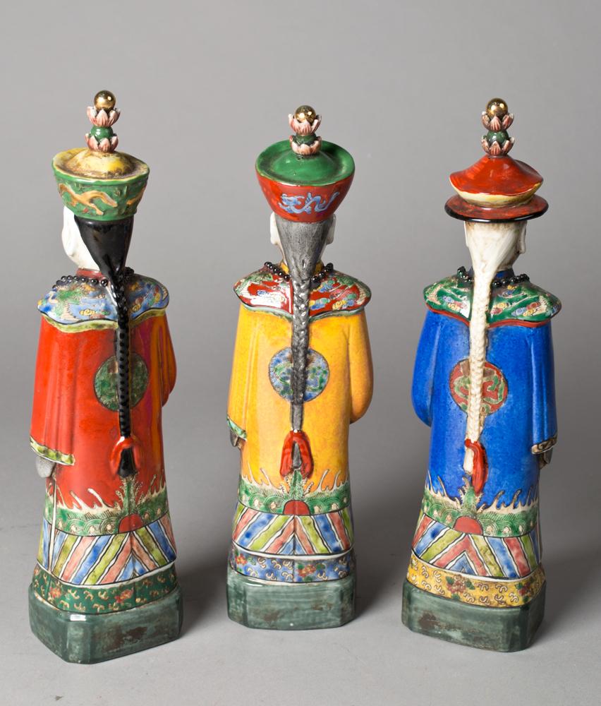 Depicting an Emperor and two Chancellors, 13" H, circa 20th century.