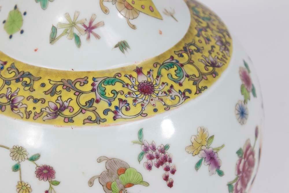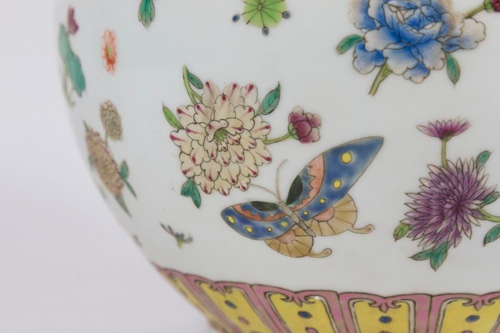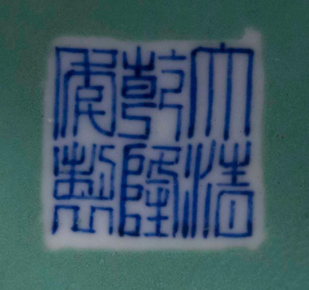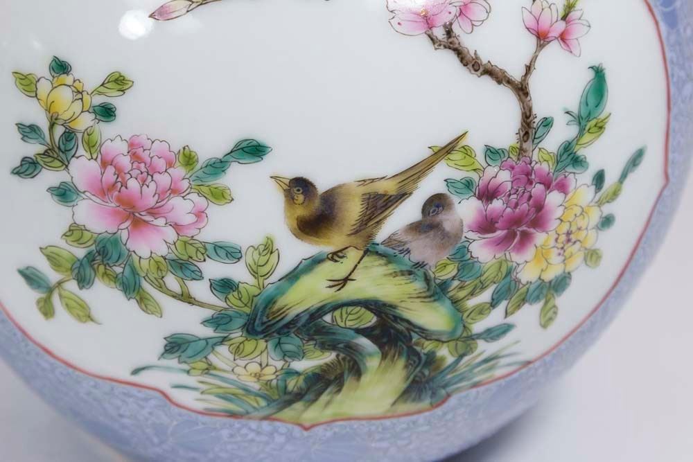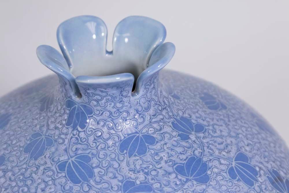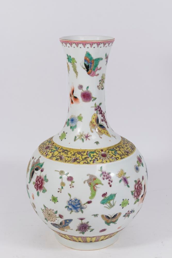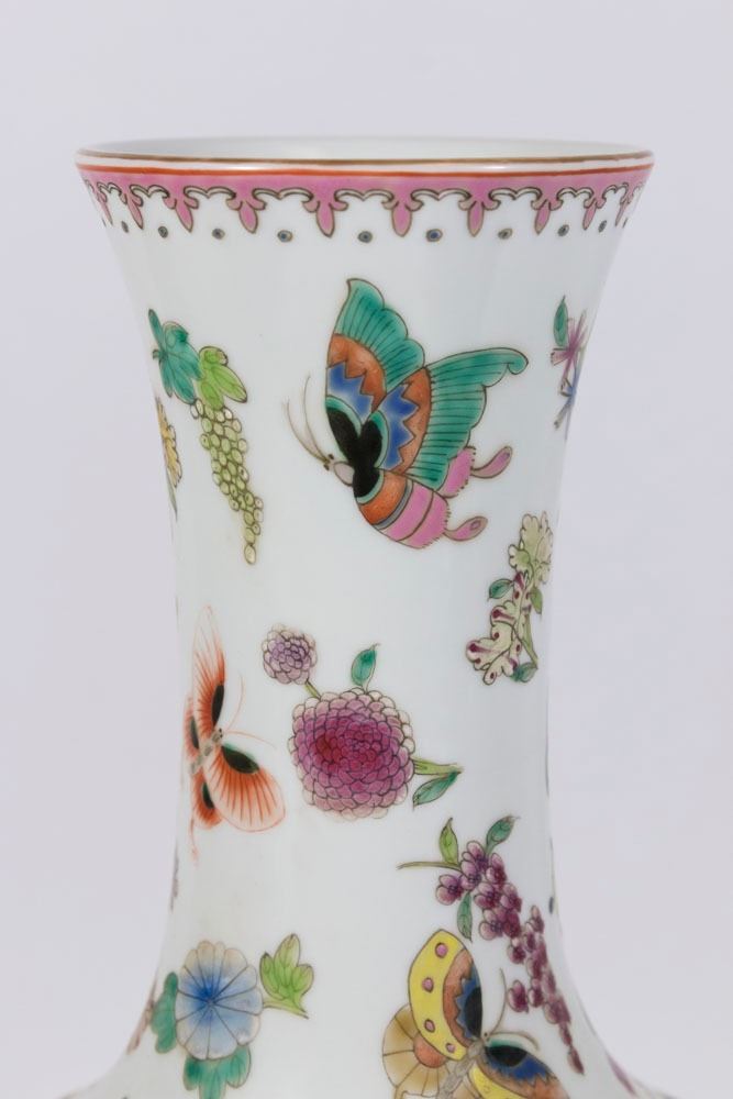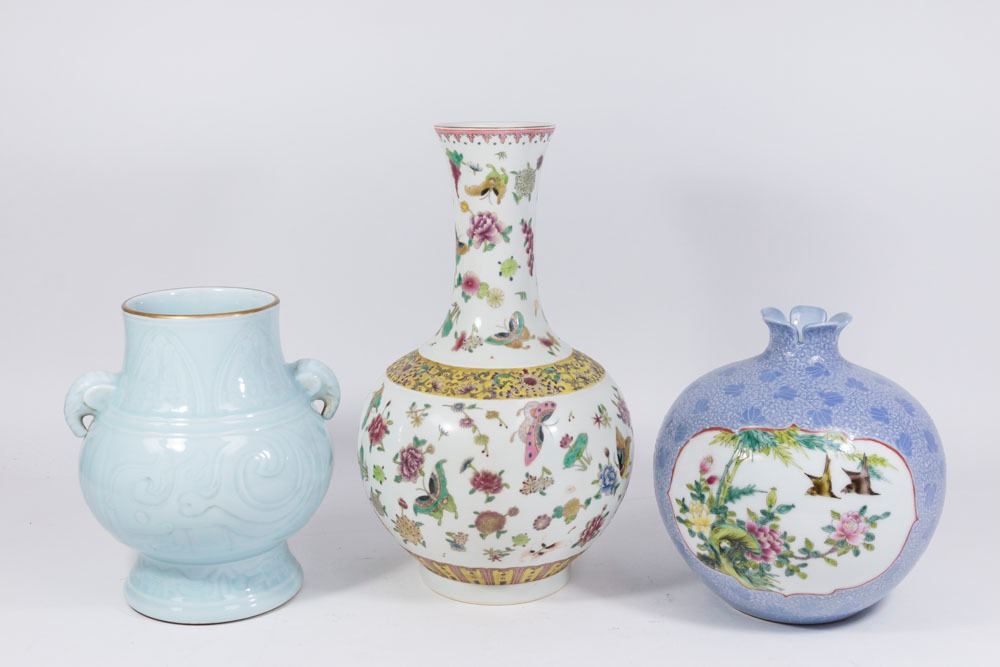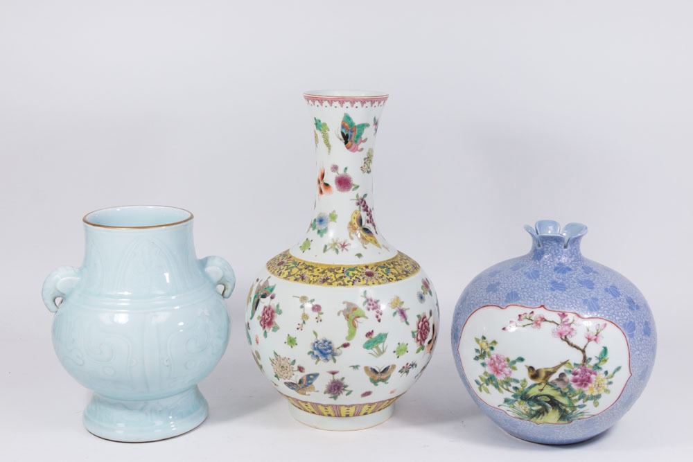 One celadon, one blue bulbous form, and one floral & butterfly design. Contemporary. Celadon approx. 10" H. Bulbous approx. 10 1/2" H. Butterfly approx. 16" H.