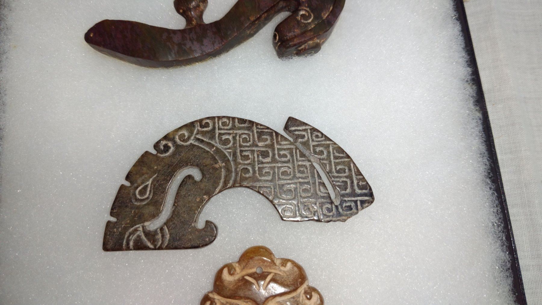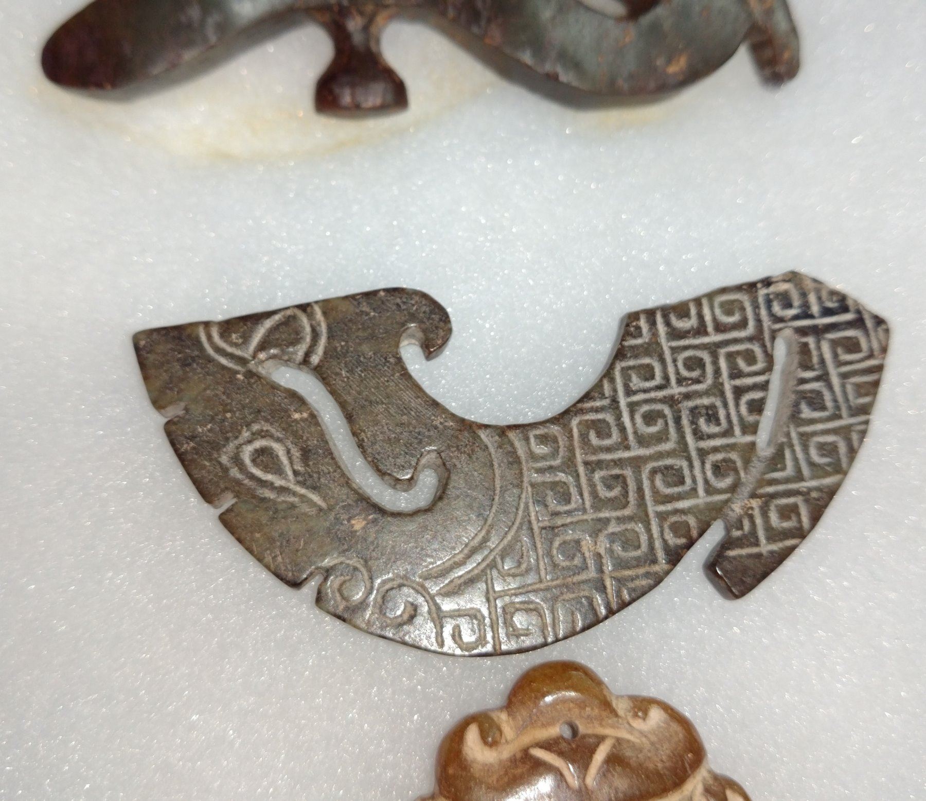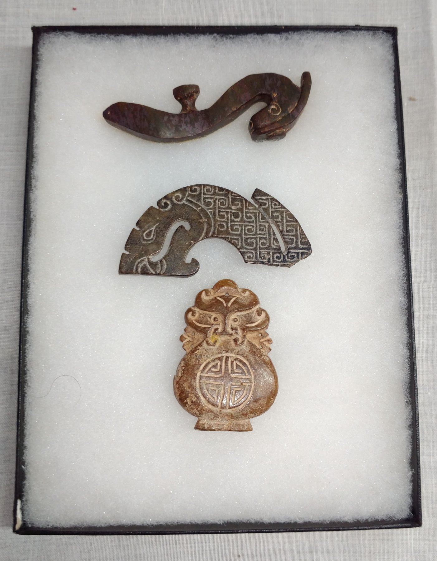 3 Chinese Relics, pre-dynastic period. Made of jade, the longest measures 3 1/2". 3 Gorges area. 1 is a belt buckle. Frame not included. Condition: Good, see images. Shipping: $18.50 w/insurance and signature.