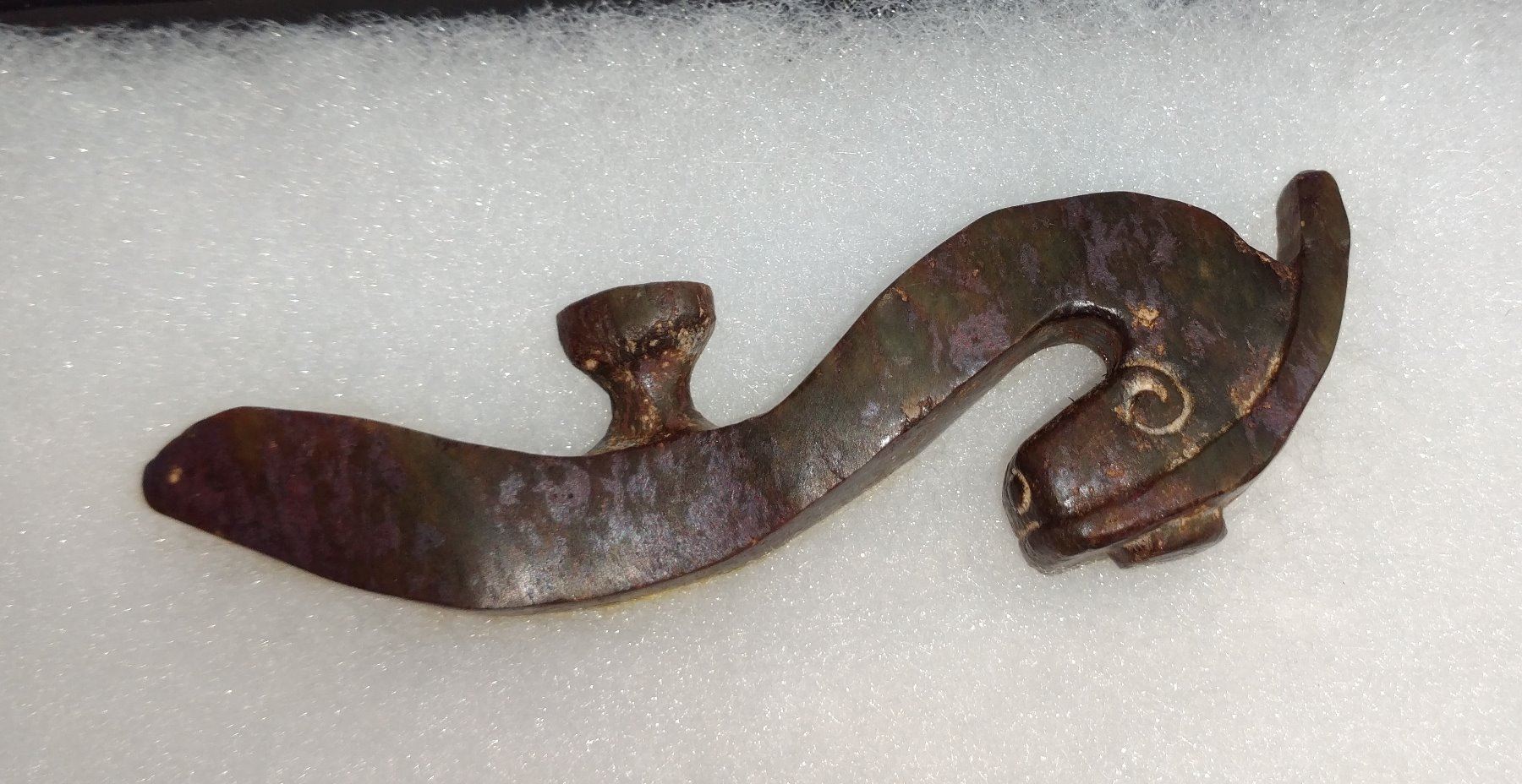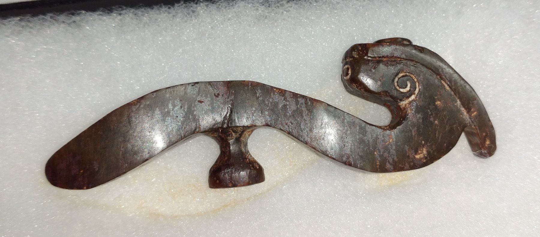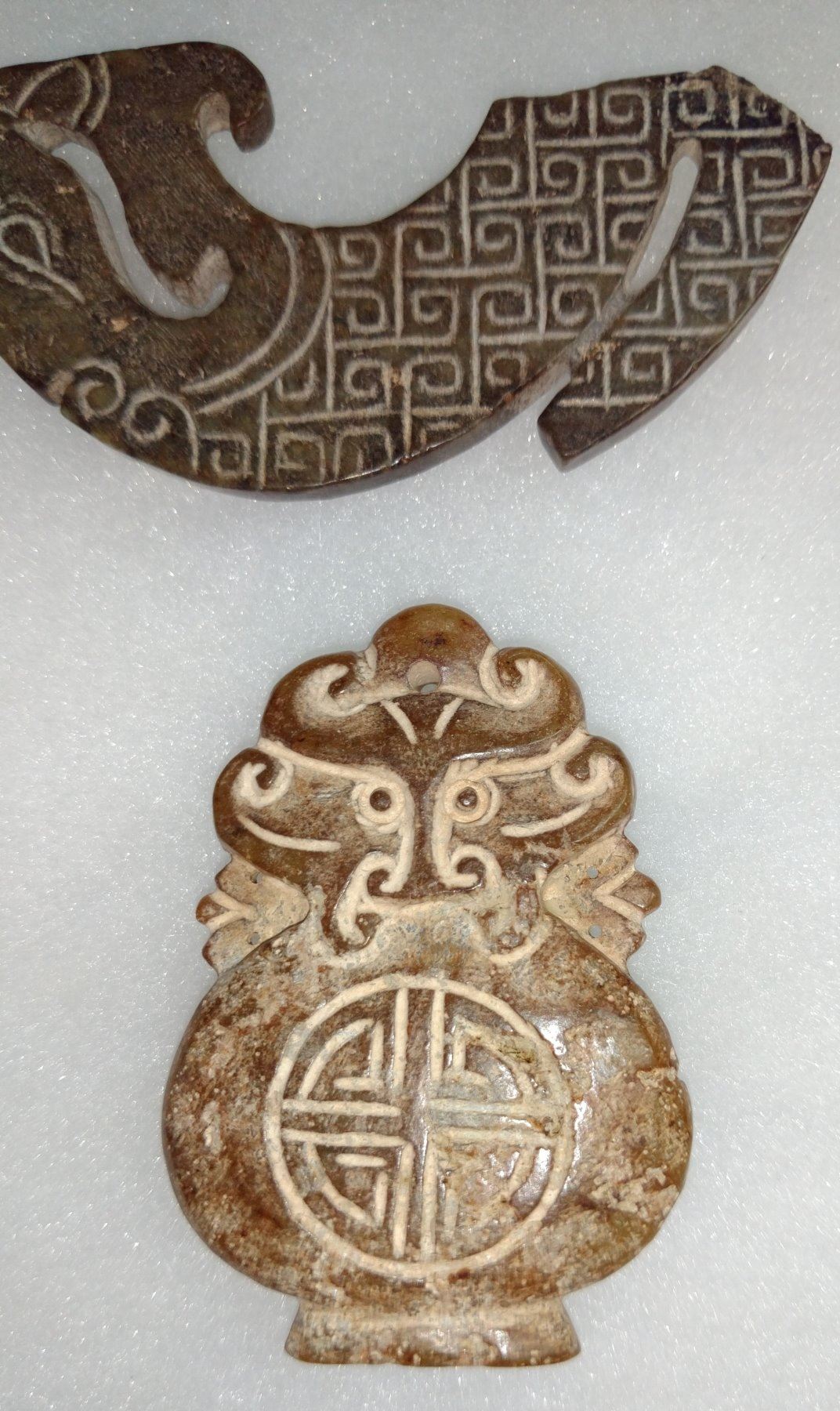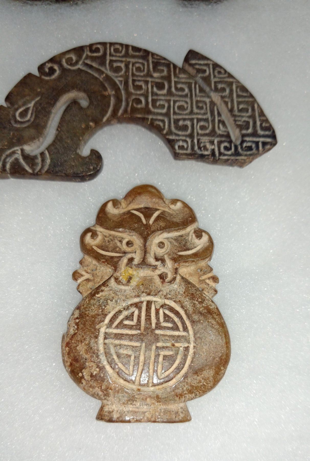 3 Chinese Relics, pre-dynastic period. Made of jade, the longest measures 3 1/2". 3 Gorges area. 1 is a belt buckle. Frame not included. Condition: Good, see images. Shipping: $18.50 w/insurance and signature.