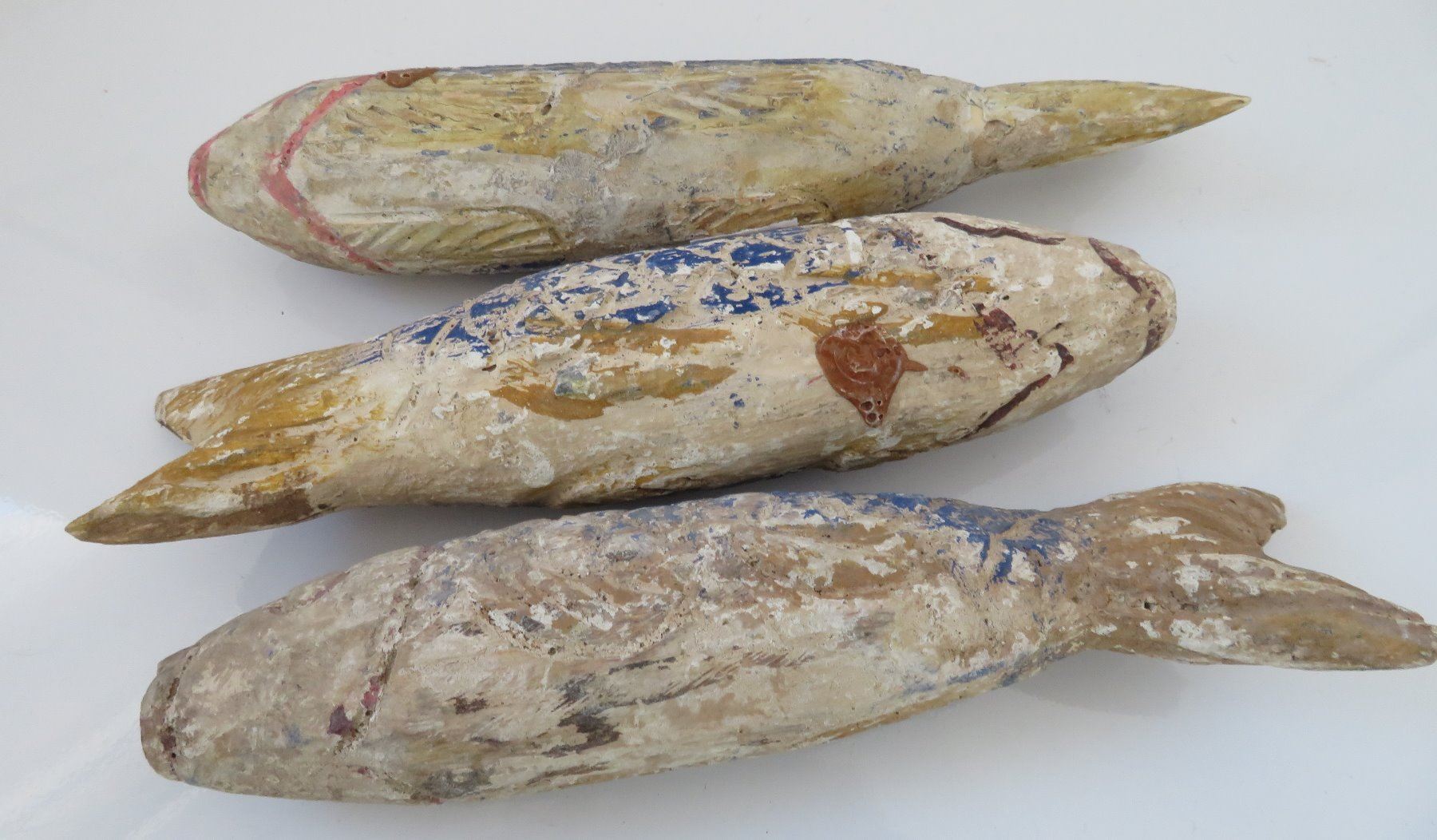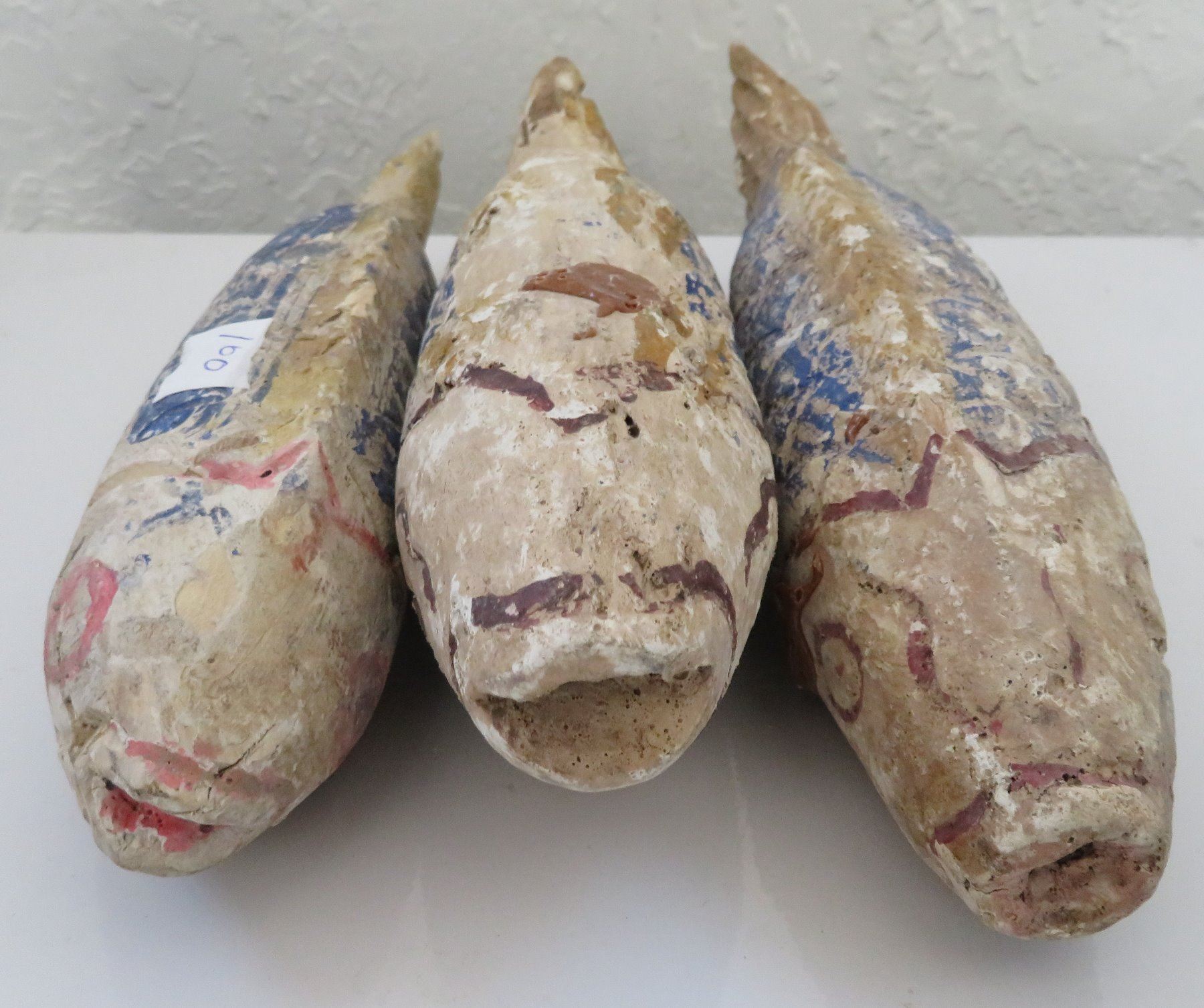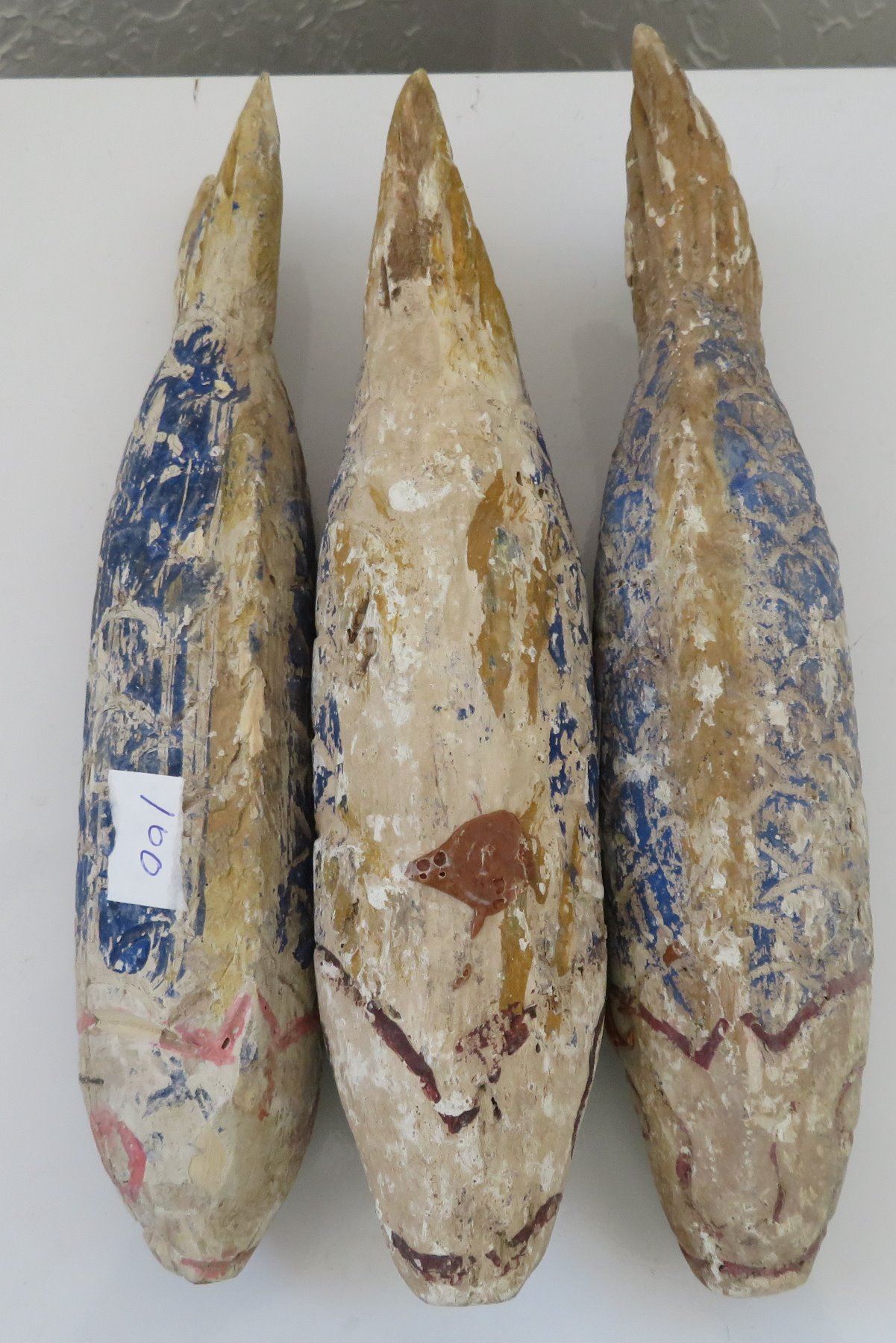 3 Chinese Wood Coy, Ming dynasty. Made of wood and paint, the items measure from 11 1/2" x 2 1/2" each. China. Bright colors. Condition: Some wear, see images. Shipping: $30.00 w/insurance and signature, due to value.