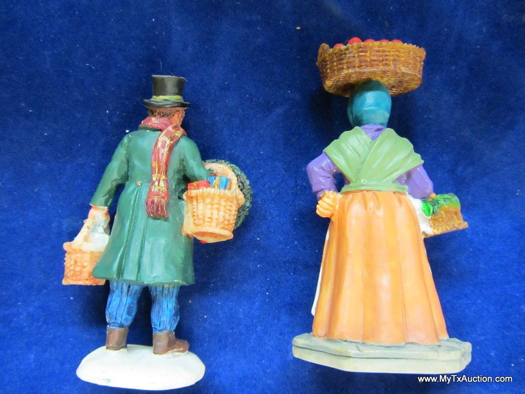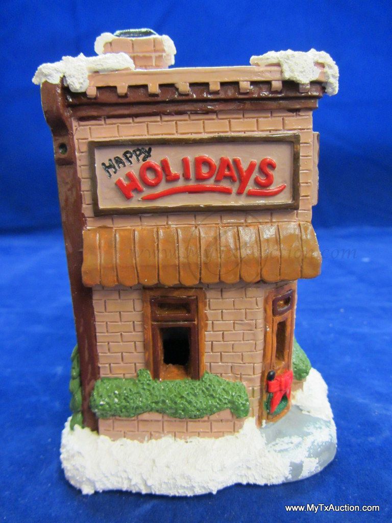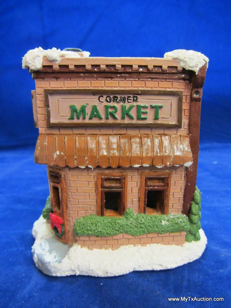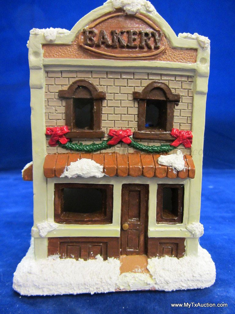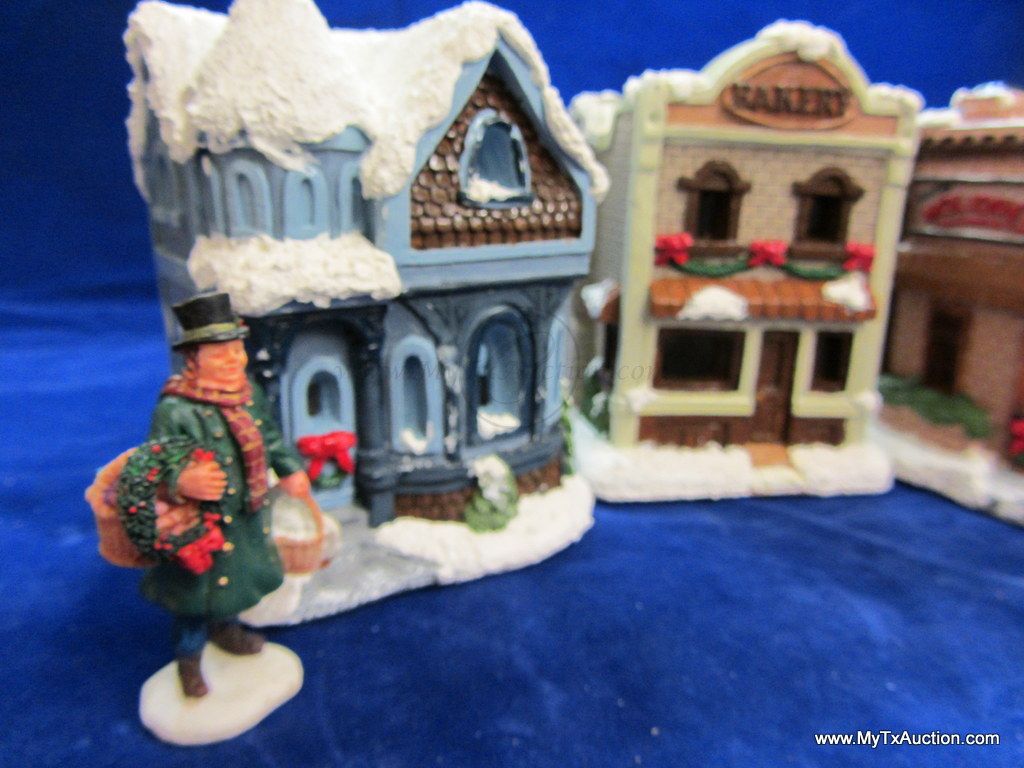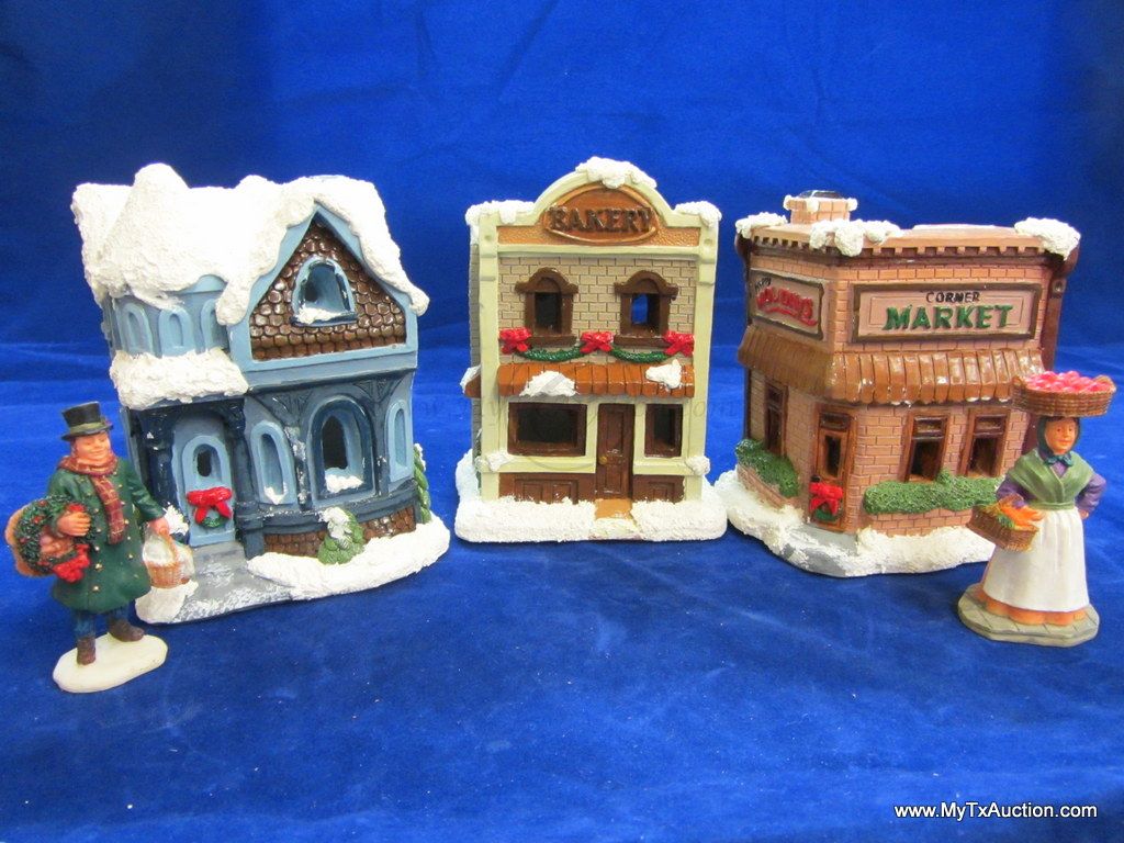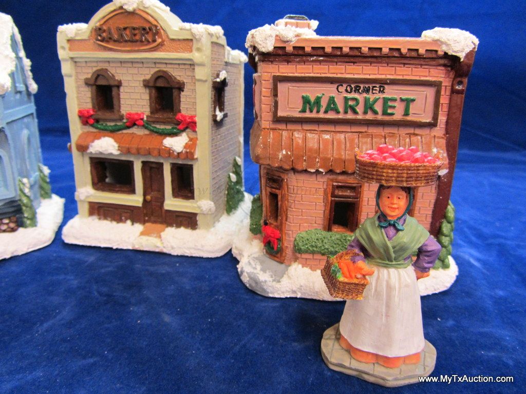 This 5 piece chalk village comes complete with 3 building an 2 Lemax Christmas village accessories figurines. Building include a 1.5 story Victorian, Bakery and a Happy Holidays corner market. The figurines include a women street vendor w/fresh veg. and Papa with baskets full of goodies and a wreath. In used very good condition NOTE: the Victorian has some minor damage (see images for details)