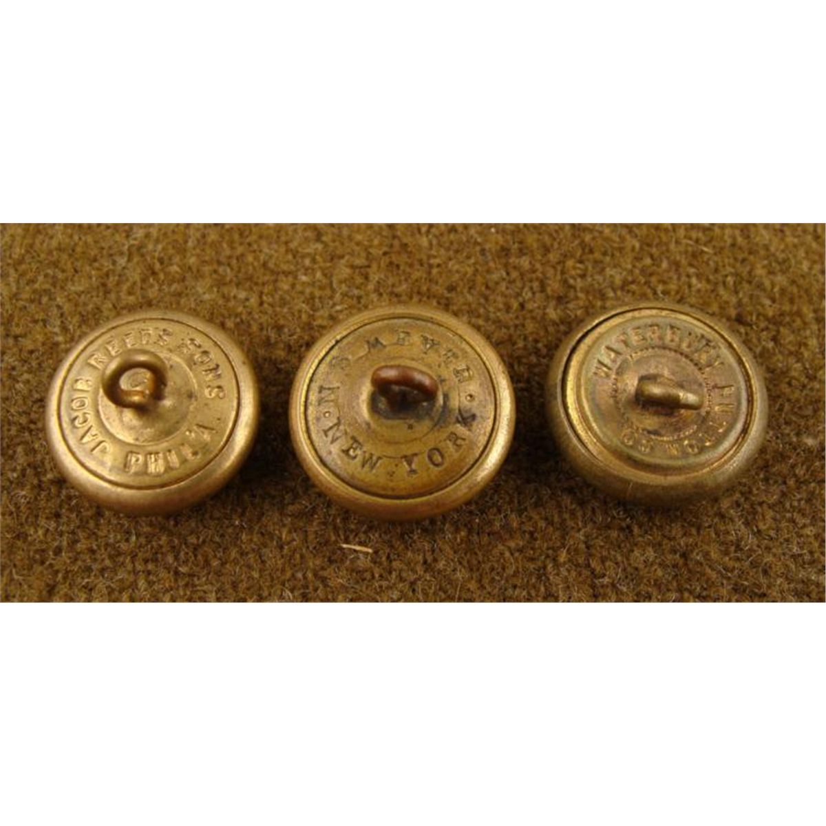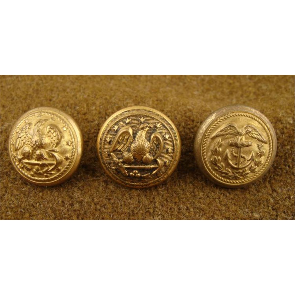 Here are 3 Naval issue gilt coat buttons from the Civil War era. The design features an eagle with anchor, two with stars and one with laurels. They are gilt, with original coat backing. One is marked "JACOB REED'S SONS, PHILA." Another is marked "N.S. MEYER, NEW YORK." The last is marked "WATERBURY BUTTON CO. They are approximately 18 mm in diameter. They are in very good to excellent condition.