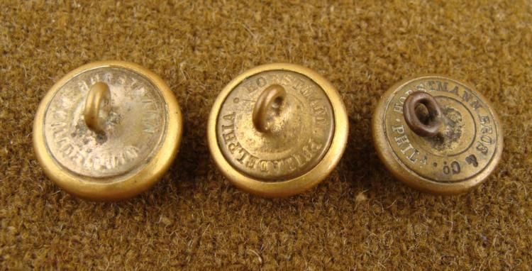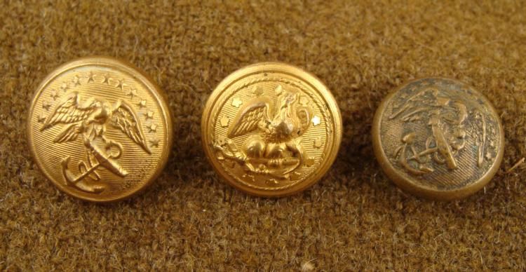 Here are 3 Naval issue gilt coat buttons from the Civil War era. The design features an eagle with anchor and stars. They are gilt, with original coat backings, one with slightly bent loop that could probably be straightened. One is marked "HORSTMANN BROS. & CO., PHIL." The other two are marked "HORSTMANN, PHILADELPHIA." They are approximately 17 mm in diameter. They are in good to excellent condition.