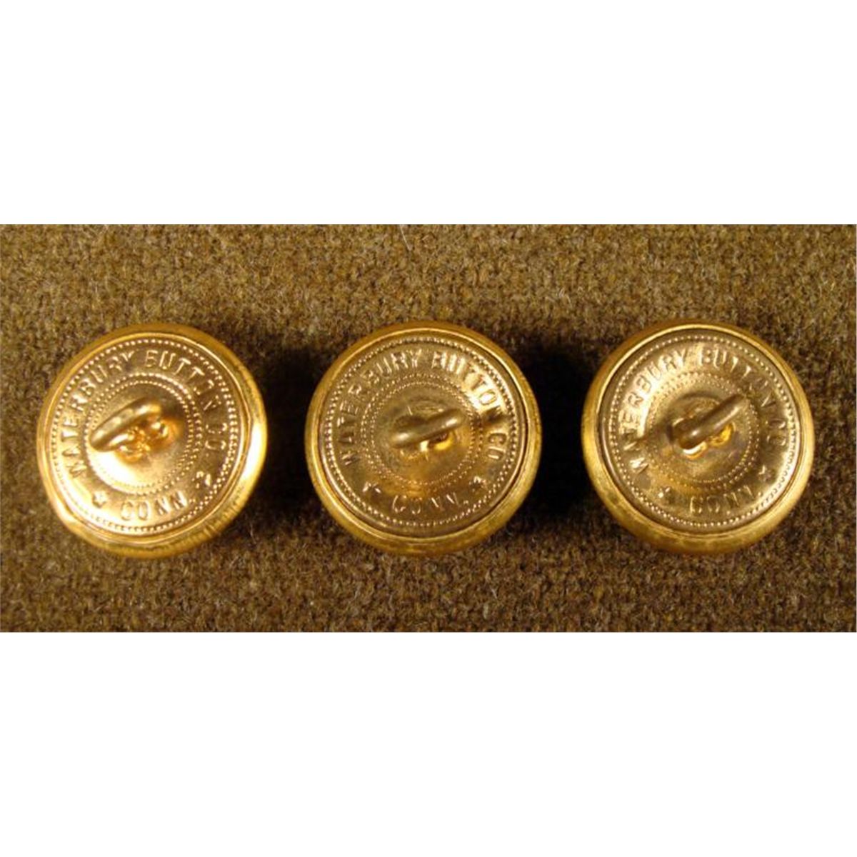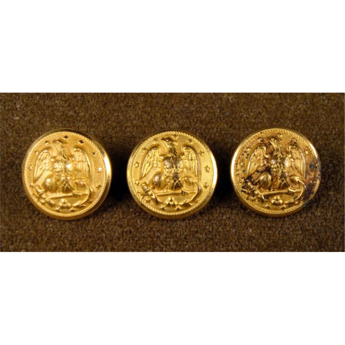 These 3 buttons are Federal issue Naval coat buttons from the Civil War era. The design features an eagle holding an anchor with stars. They are gilt, with original coat backings. They are back marked "WATERBURY BUTTON CO. CONN." They are approximately 7/8 inch in diameter. One is in excellent condition, and the others are good to very good, with some gilt rub, stain marks, and denting on the reverse.