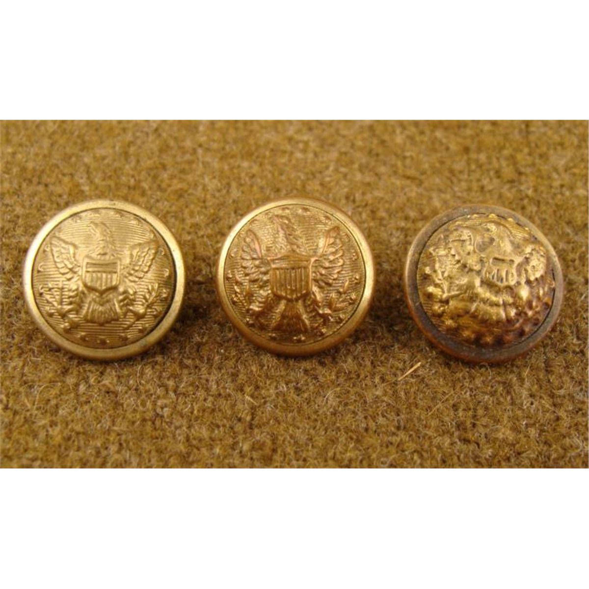 These are 3 small size gilt coat buttons from the Civil War era. The design features an eagle with shield and stars. They are gilt, with original coat backings. One is marked "HORSTMANN BROS. & CO., PHIL." One is marked "EXTRA QUALITY." One is unmarked. They are approximately 5/8 inch in diameter. They are in good to excellent condition.