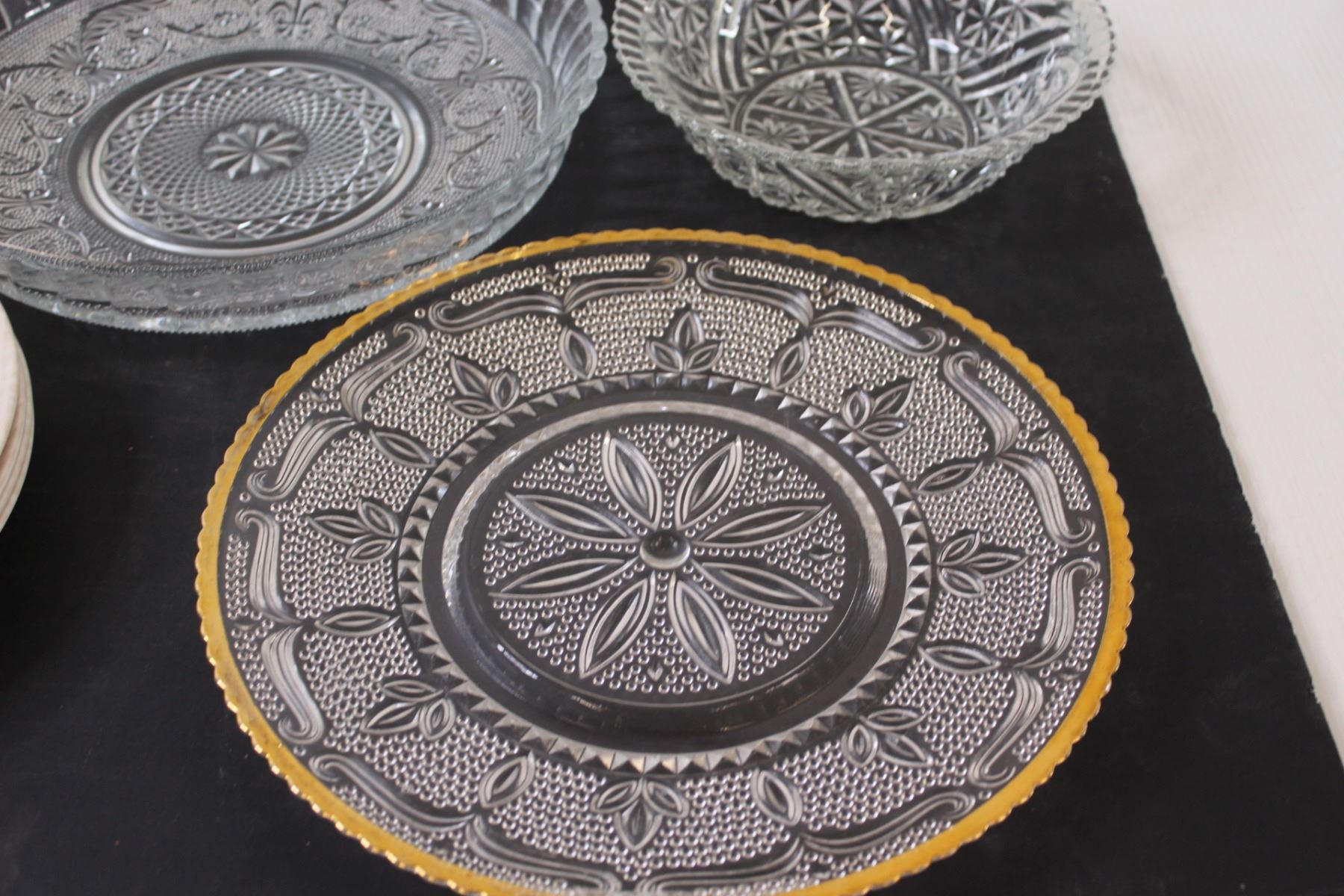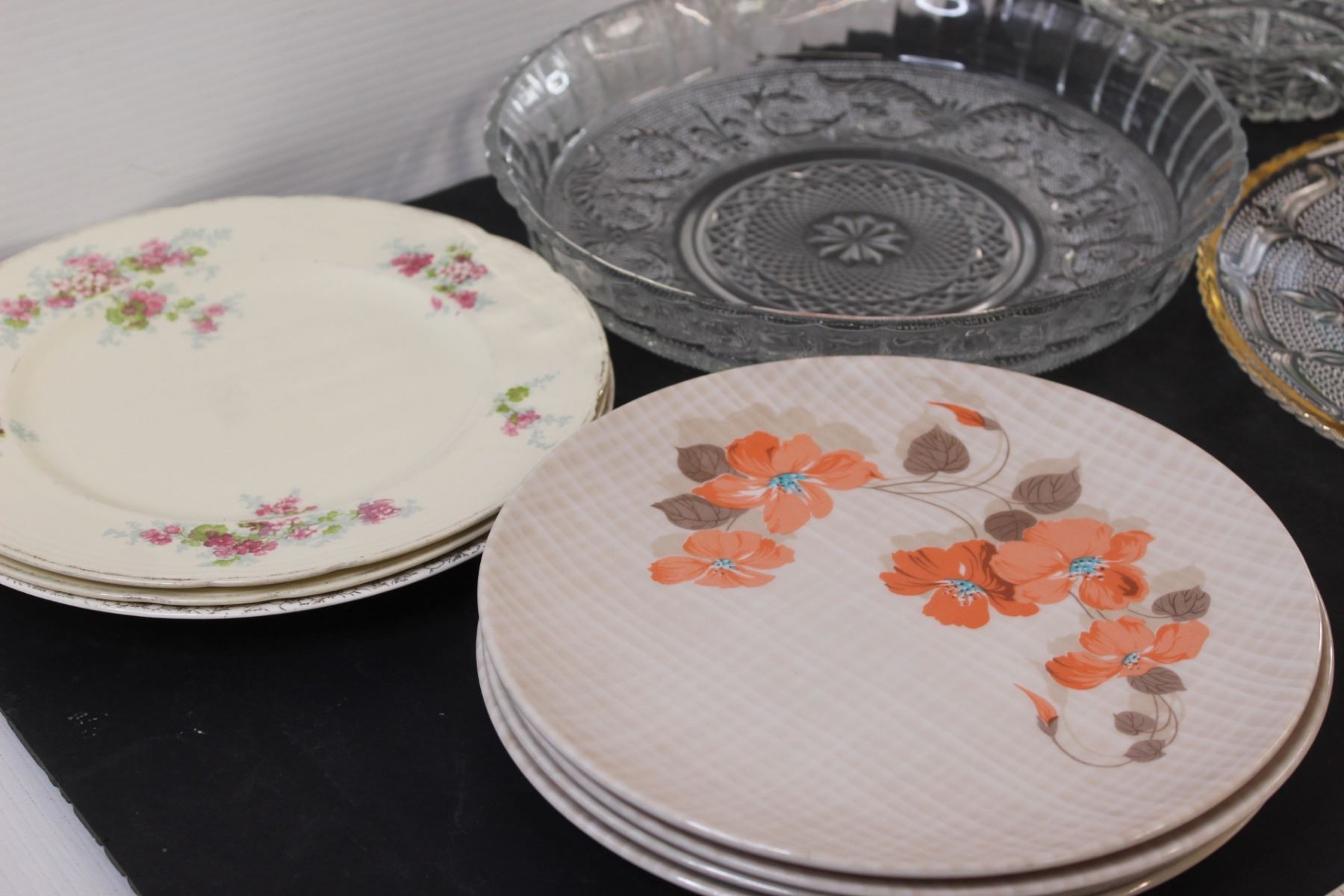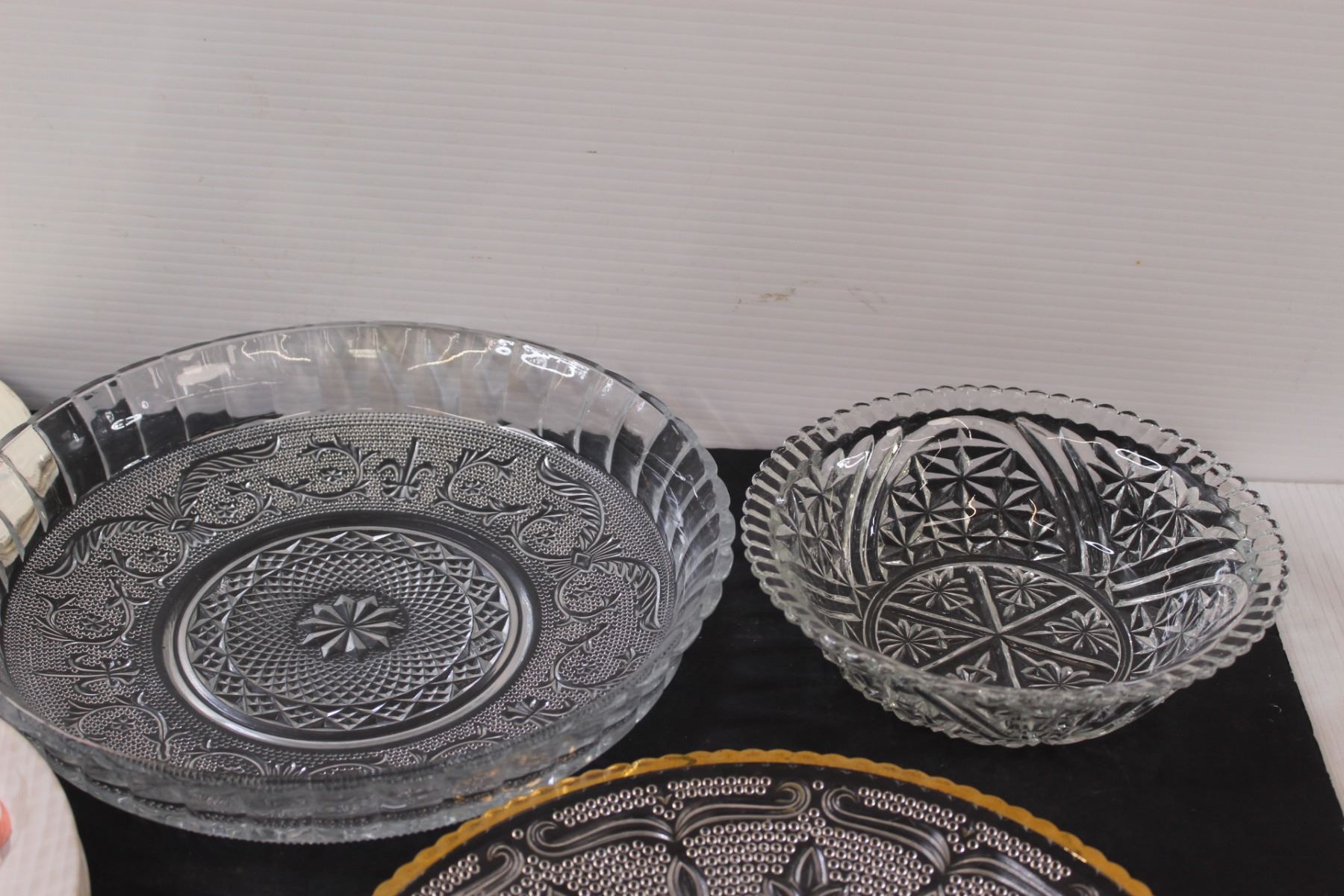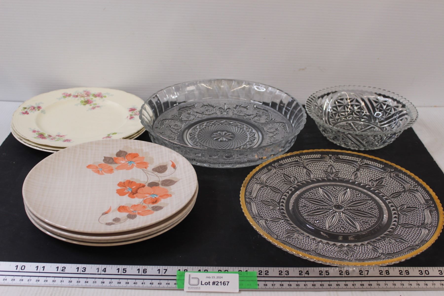 (3) Clear Glass Serving Dishes, (7) Assorted Plates