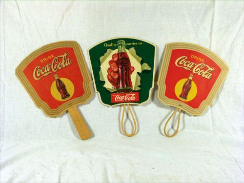 Three Coca Cola Cardboard Fans, including 1930 St.Louis, MO. 1950 Flat River, MO and 1930 St.Louis, MO. All in excellent condition. Aprox 8 X 11 inches.