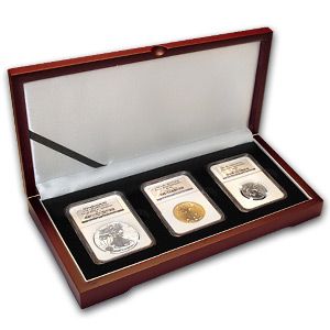 3-Coin Tri Metal Reverse Proof American Eagle Ann Set P **|**|** Beautiful 3-Piece Reverse Proof Set! This unique set includes the 1 oz Gold American Eagle Reverse Proof, the 1 oz Silver American Eagle Reverse Proof and the 1/2 oz Platinum Eagle Reverse Proof. All three coins have been graded Proof 70 by NGC! The Gold ; MSRP: $17000