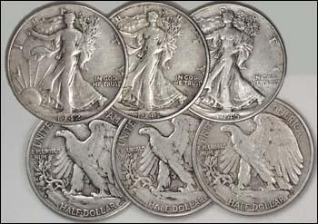 1941-5 andom 3 coins. Circualted Condition - Clad in the American flag, Adolph A. Weinman's patriotic Walking Liberty emerged during World War I and was due for retirement in 1942, but Congress extended the enormously popular seriesthrough World War II. Liberty strides confidently towards a new dawn carrying branches of laurel and oak, signifying civil and military traditions. On the reverse a powerful American Eagle with outswept wings is ready to defend our freedoms.We'll select three different 1941-1945 issues in nicely detailed Very Fine quality. They saw relatively light circulation on the homefront during World War II. 30.6mm