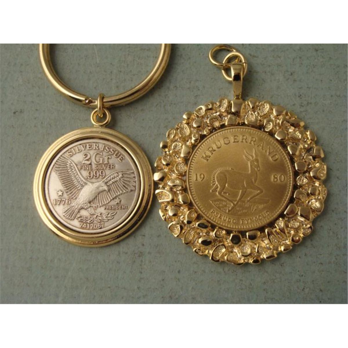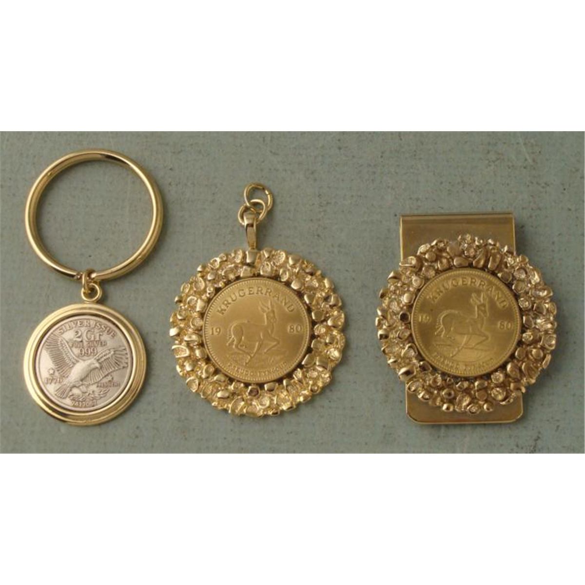 These three coins were made into souvenir items, all in gold tone metal * Braemoor1873 2 GR. Silver Issue key chain1980 Krugerand money clip1980 Krugerand pendant