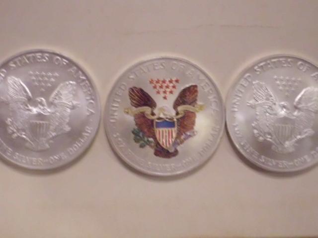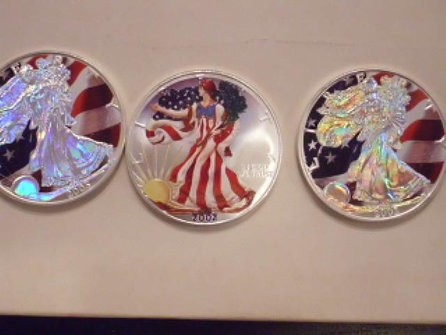 3 Colorized US .999 Fine Silver Eagles, 2002, 2003, 2005