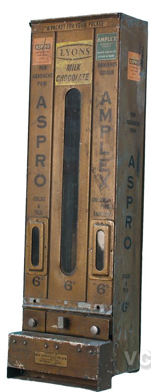 3 Column Metal Wall Hanging Vending Machine w/ Original Decals: Lyons Milk Chocolate, Aspro For Headache, Pain, Colds & Flu & Amplex Deodorant Tablets