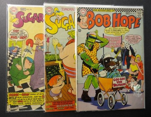 Adventures of Bob Hope #106 Sept 1967 Neal Adams Art "Good to Very Good" Sugar and Spike #78 Sept 1968 "VG+", Sugar and Spike #79 Nov 1968 "Good" (Looks Much Better, but Chunk Missing Back Cover). Total Overstreet Book Value Adjusted for Condition $35.00. Est. Value $35.00 - $55.00.