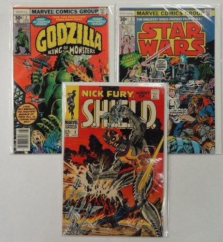 3 Comics: Godzilla #1 Aug 77, Star Wars #2 Aug 77, Nick Fury Agent of Shield #2