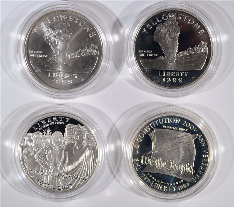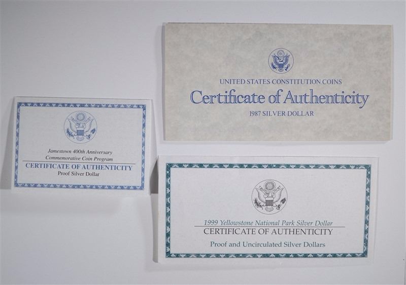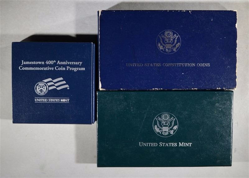 3 Commemorative Coin Sets - 2007 Jamestown Proof Silver Dollar, 1999 Yellowstone 2 Piece Set, 1987 Constitution Proof Silver Dollar. ESTIMATE $150 - $175.