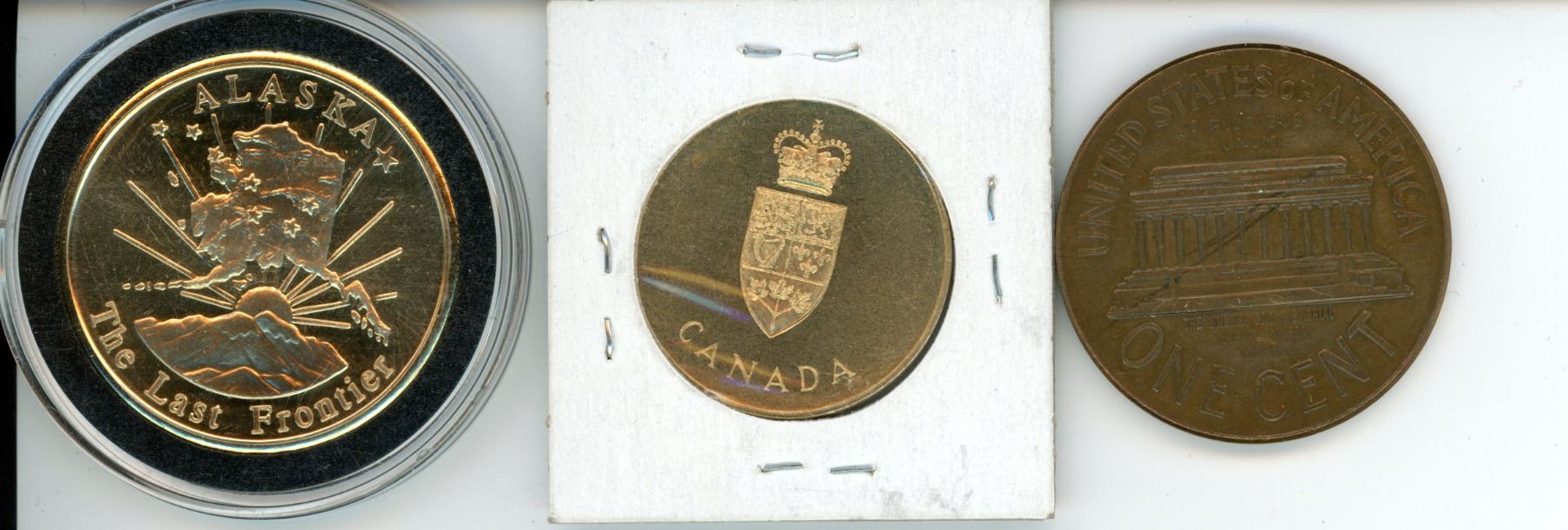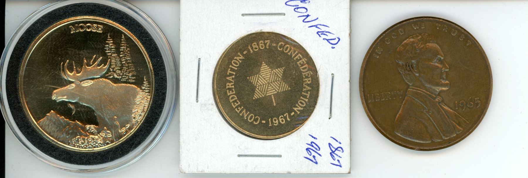 3 Commemorative Tokens - Canada Confederation 1867-1967, Alaska with Moose and Lincoln Penny Memorial