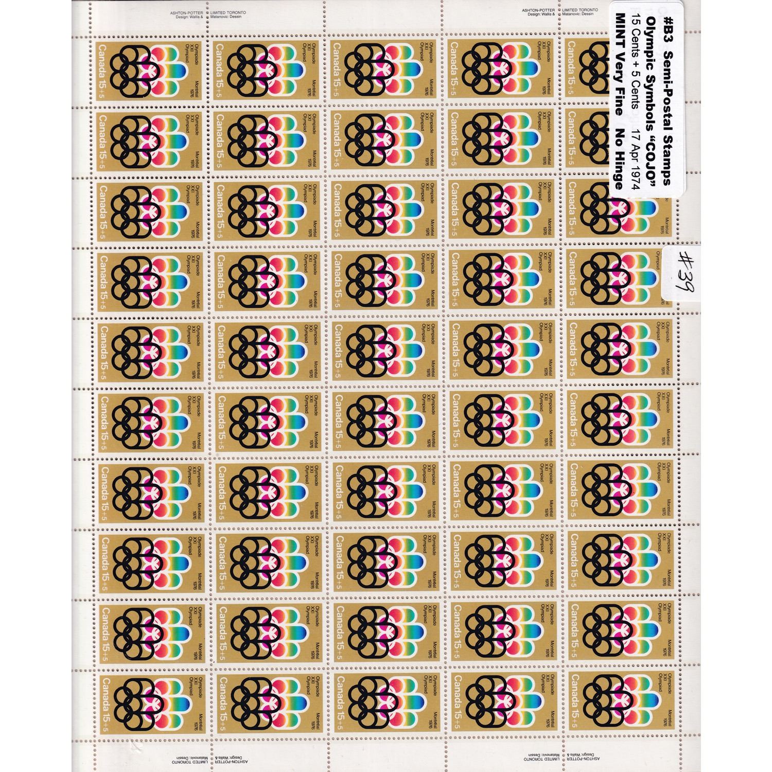 3 Complete sheet of Semi-Postal stamps all with Olympic "COJO" and surcharge. Lot includes: 8-cent + 2-cent, 10c + 5-cent, 15-cent + 5-cent MNH VF.