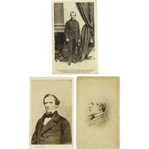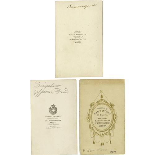 <B>Three Confederate <I>Cartes de Visite</B></I> - Lee, Davis, and Beauregard.</B></I> A Confederate Trio: Commander, President, and General! Robert E. Lee starts off the group with a fantastic and iconic-looking side view in his grey Confederate uniform; his three stars are visible on the collar of his jacket. Lee hailed from one of the most distinguished families in Virginia. Lee's father, Light-Horse Harry, was a famous Revolutionary War soldier, and his wife, Mary Custis, descended from Martha Washington. He graduated second in his class from West Point in 1829, and then worked in the engineering department. Fighting with distinction in the Mexican War, in 1859 he put down John Brown's raid on Harper's Ferry. After Virginia left the Union, he cast his lot with his native state and led his Army of Northern Virginia to many victories, including Second Manassas, Fredericksburg, and Chancellorsville. His ill advised attack on the center of the Union line at Gettysburg stopped his invasion of the North. He finally surrendered to Grant at Appomattox on April 9, 1865, and was paroled. Lee became president of Washington College now Washington & Lee University , which is where he died and is buried. This fantastic image is in very fine condition; it would be hard to find a comparable example in this condition; minor foxing on emulsion; bears the Anthony imprint on verso; pencil notations on verso; no border; square corners. <BR><BR>The second item is a rather odd looking engraving of Jefferson Davis. Made by Duroni & Murer of Paris, this engraving bears little likeness to the Confederate President, who risked everything, and held fast to his belief in the South. Jefferson was unable to launch any sort of planned and strategic attack on the more organized and industrially backed Northern armies. In very fine condition; bears the Duroni & Murer imprint on the verso; pencil notations on verso; soiling on emulsion; no border; square corners. <BR><BR>The third image is of the Confederate General P.G.T. Beauregard. General Beauregard was a Confederate commander and <I>postbellum</B></I> he became active in the railroad industry as well as supporting voting and civil rights of freed slaves. He was one of the eight full generals in the Confederate Army and after the defeat of the South he was one of the few high-ranking Confederates to support the rights of freed slaves. Shown here in his Union uniform, one which he would later trade in for the shades of grey worn by the Confederacy. Shown in staff officer's gear, Beauregard looks distinguished and brave in this shot. Bears the imprint of C.D. Fredericks on the verso. In very fine condition; several blemishes on the emulsion, not affecting the body of the General; ink notation on verso; no border; square corners.<BR><BR><b>Shipping:</b> Small Flat (<a target="_blank" href="http://www.heritageauctions.com/common/shipping.php">view shipping information</a>)