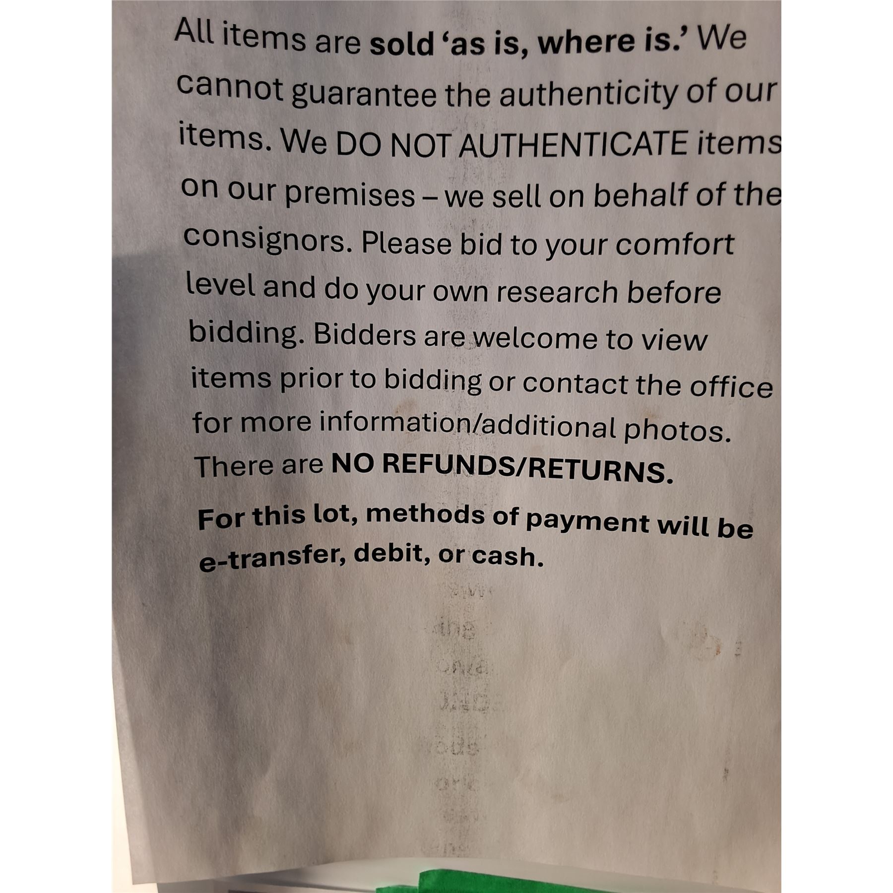 A online bidding premium may be applied to each lot purchased on the Internet. Federal GST and corresponding Provincial Sales Tax will apply to all purchases where applicable.