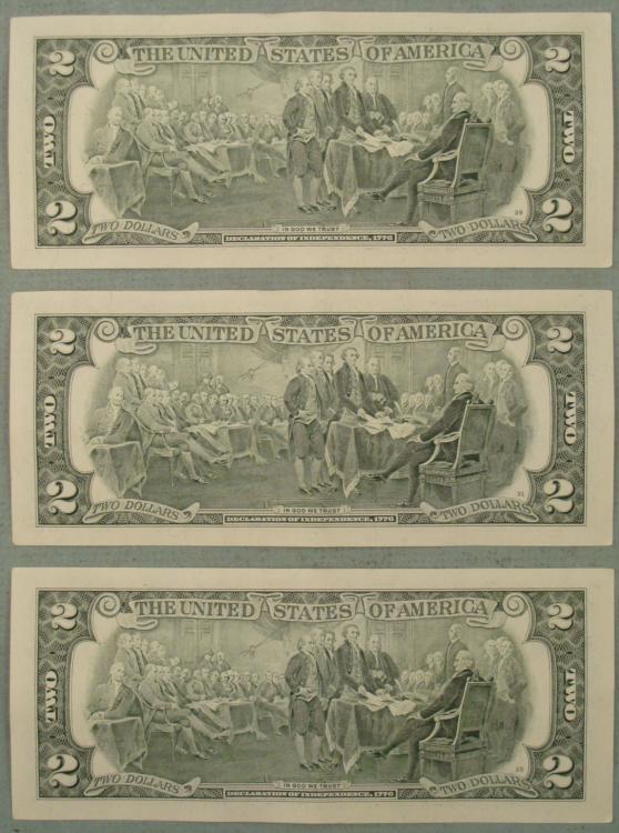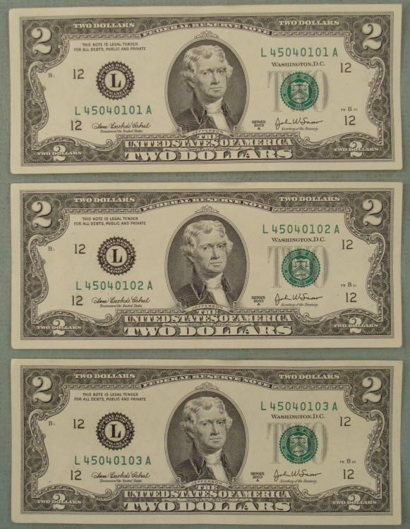 3) 2003-A $2 bills, with consecutive serial numbers * Mint mark: L (San Francisco)Grade: Crisp Uncirculated