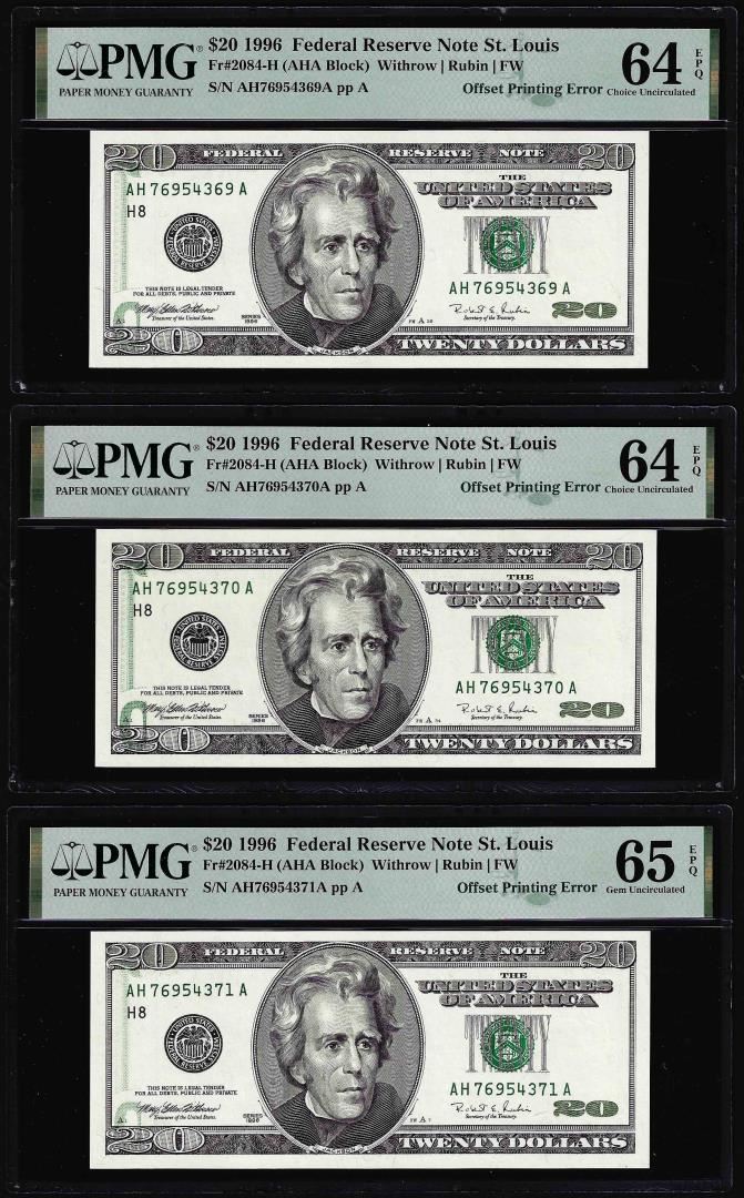 (3) Consec. 1996 $20 Federal Reserve Offset Error Notes PMG Ch. Uncirculated 64/65EPQ