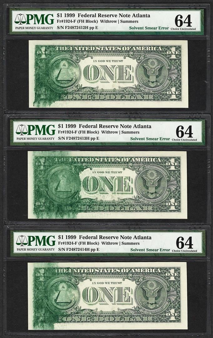 One (3) Consec. 1999 $1 Federal Reserve Notes Solvent Smear ERROR PMG Ch. Uncirculated 64. PMG Certified.